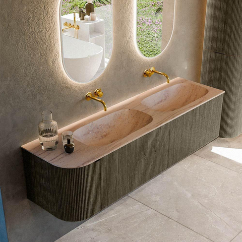 Avec ce meuble de salle de bains spacieux, vous créez en une seule fois une zone de lavabo luxueuse et bien pensée, parfaite pour une grande salle de bains familiale ou une salle de bains au style hôtel chic. La largeur généreuse de 165 cm, la forme organique arrondie sur le côté gauche et la combinaison du solid surface épuré avec les tons bois chaleureux en font un élément phare à la fois moderne et intemporel. Grâce au double lavabo à droite, ce meuble est idéal si vous êtes souvent à deux en même temps dans la salle de bains, tandis que l’aménagement astucieux avec tiroirs et une porte offre amplement d’espace de rangement pour toutes vos affaires du quotidien. La teinte de gris douce Shadow se combine facilement avec des carreaux clairs comme foncés, ce qui permet à ce meuble de s’intégrer dans de nombreux styles d’intérieur : du minimaliste et scandinave au style hôtel chic. Si vous recherchez un meuble qui combine design, facilité d’utilisation et atmosphère ordonnée et apaisante, c’est un choix particulièrement judicieux.
