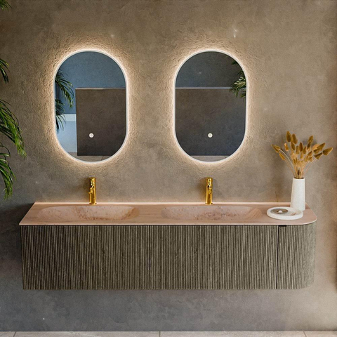 Avec ce meuble de salle de bains spacieux, vous faites entrer un véritable accroche-regard chez vous, qui s’intègre parfaitement dans une salle de bains moderne et axée sur le design. La douce courbe sur le côté droit apporte non seulement une touche ludique, mais rend également le passage le long du meuble plus confortable, même dans les espaces un peu plus étroits. Grâce à la largeur généreuse, c’est un choix judicieux pour les familles, les couples ou toute personne qui aime utiliser la salle de bains à deux, sans se gêner mutuellement. Le double plan-vasque avec trous de robinet à gauche est idéal si vos arrivées d’eau se trouvent de ce côté ou si vous souhaitez garder plus d’espace libre à droite. La belle couleur Shadow et la façade rainurée s’accordent parfaitement avec les styles d’intérieur populaires tels que l’hôtel chic, le moderne industriel et le minimalisme scandinave. Vous combinez ainsi un espace de rangement pratique avec une répartition bien pensée et un ensemble élégant qui vous accompagnera pendant des années.