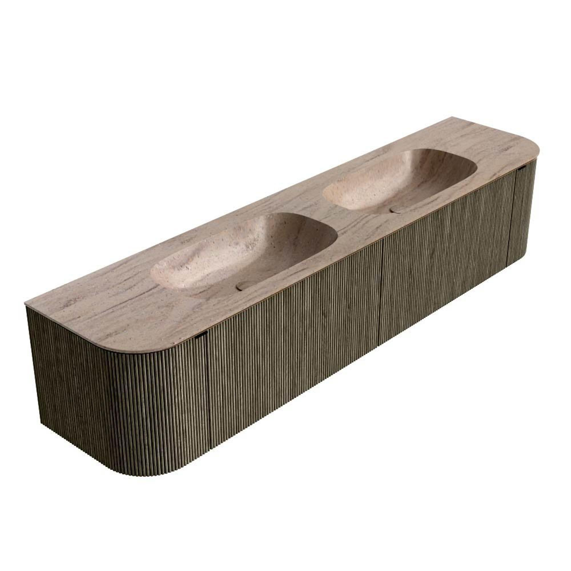 MONDIAZ KURVE-DLUX Meuble de salle de bains 200cm arrondi gauche + droite couleur Shadow avec 2 tiroirs et 2 portes. Lavabo STOR SMALL Double sans trou de robinet Saba.