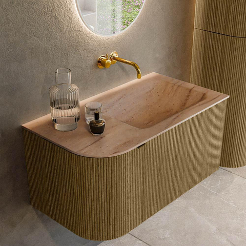 La couleur Dusk avec façade à rainures verticales donne au meuble une apparence luxueuse et digne d'un vrai meuble, qui apporte immédiatement plus d'ambiance et de caractère à votre salle de bains. La texture capte subtilement la lumière et évite que la façade paraisse plate, tandis que la teinte bois se combine facilement avec des carreaux blancs, couleur sable ou au contraire foncés. Grâce au système push-to-open, aucun bouton ni poignée visible n'est nécessaire, ce qui crée un aspect épuré et minimaliste. Cela le rend particulièrement adapté si vous aimez une salle de bains moderne et bien ordonnée, sans surcharge visuelle, mais avec des touches chaleureuses et naturelles.