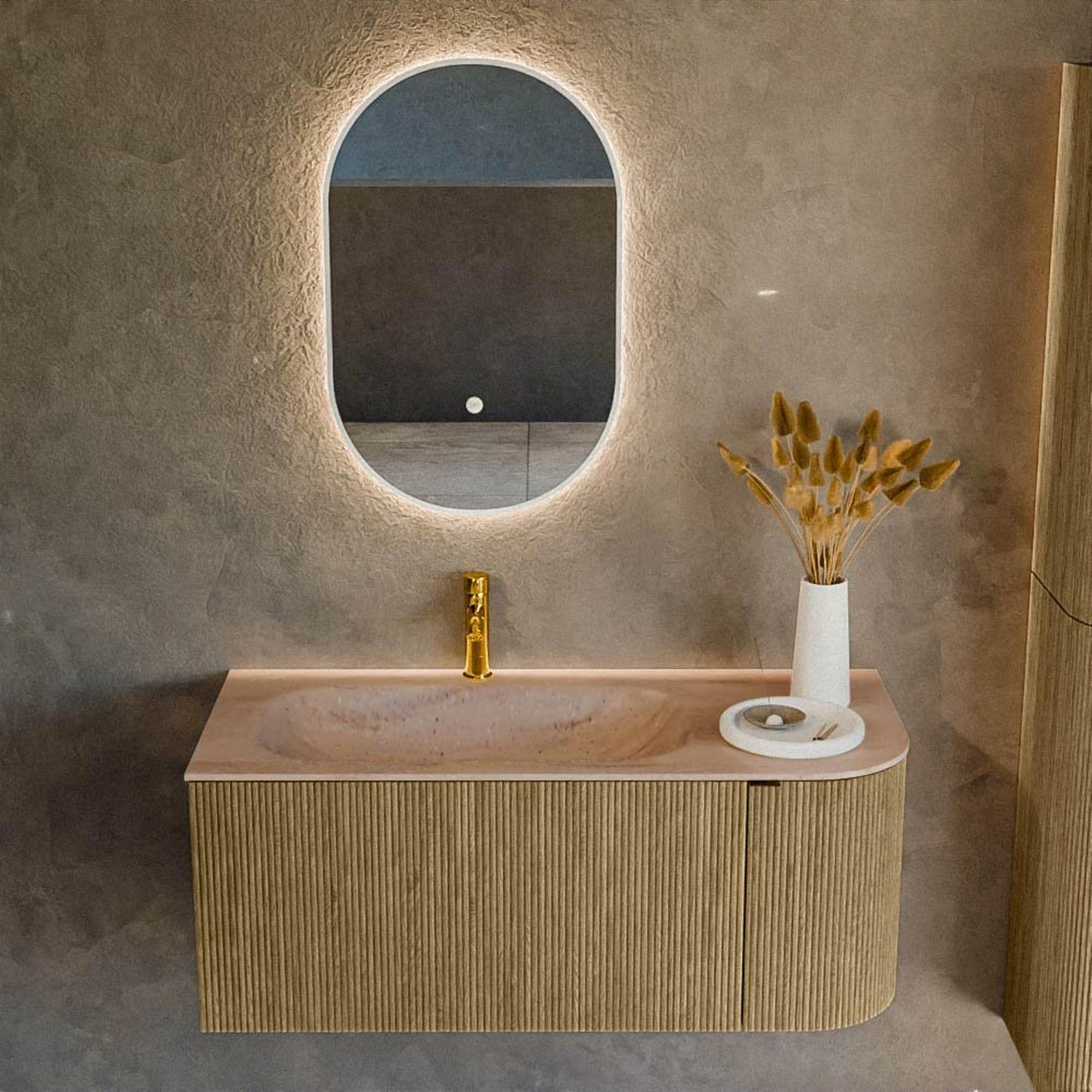 La combinaison du côté droit arrondi et de la façade nervurée verticale crée un design qui attire immédiatement le regard, sans être tape-à-l'œil. La couleur Dusk offre une apparence chaleureuse de type bois qui apporte de la sérénité à la pièce et s'accorde sans effort avec des carreaux clairs comme foncés. Les angles arrondis ne sont pas seulement élégants, ils rendent également le passage dans une petite salle de bains un peu plus agréable et plus sûr. Grâce au montage mural, le meuble semble flotter, ce qui agrandit visuellement l'espace et s'intègre parfaitement dans une salle de bains moderne et minimaliste. C'est un meuble qui donne à votre salle de bains une apparence haut de gamme digne d'un intérieur.