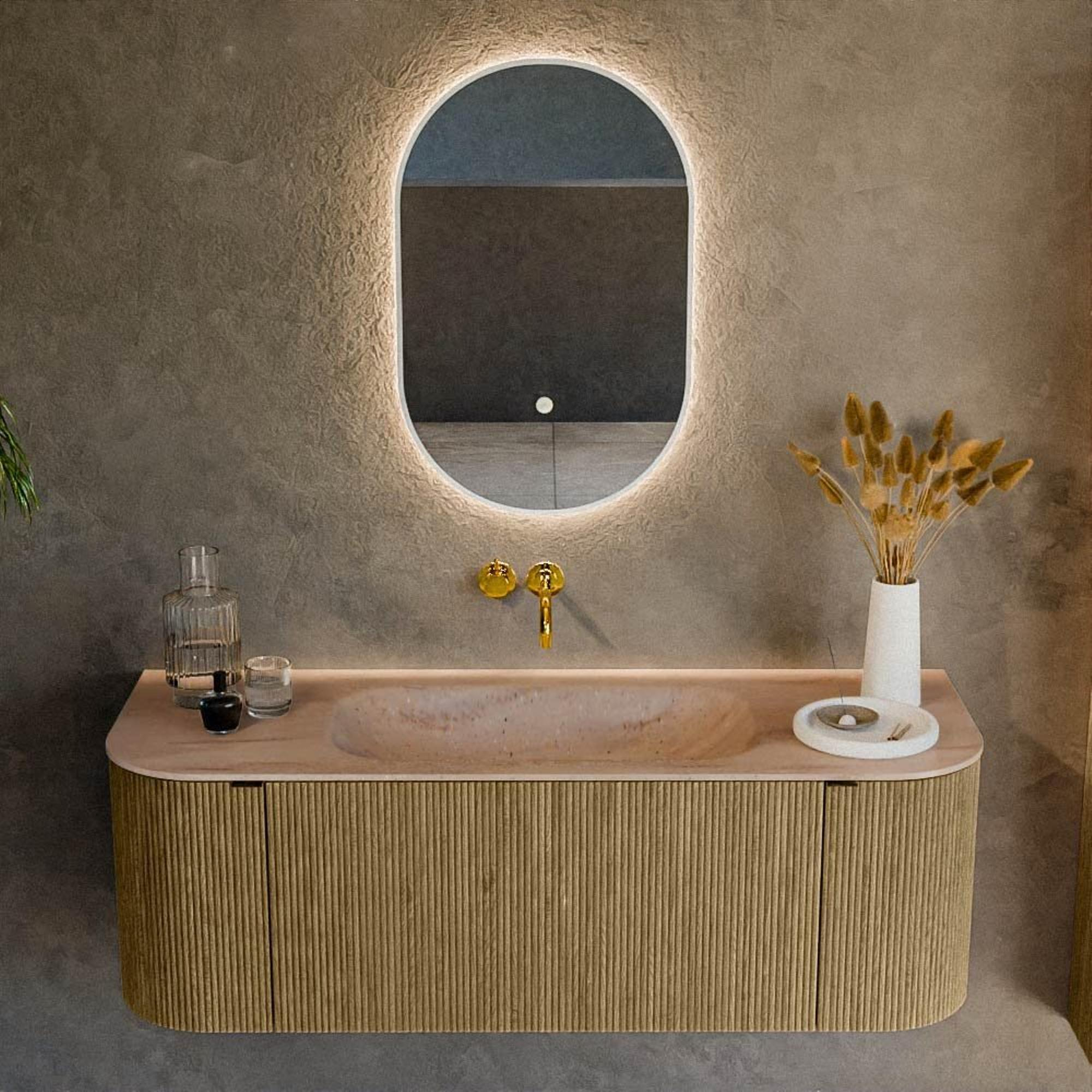 La forme arrondie des deux côtés donne à ce meuble de salle de bains un caractère unique, presque comme un meuble de séjour, qui se distingue des armoires rectangulaires standard. Les façades avec structure à nervures verticales apportent une profondeur supplémentaire et une touche de luxe à votre salle de bains, tandis que la couleur Dusk s’accorde parfaitement avec les tendances actuelles de carrelage dans les tons gris, beige et naturels. Comme la vasque est positionnée au centre (modèle Big Small), l’ensemble reste équilibré et la composition paraît calme, même dans des espaces plus réduits. La combinaison avec la vasque Saba en solid surface crée un beau contraste entre le bois chaud et la surface mate épurée. Ce meuble s’intègre parfaitement dans les salles de bains modernes, scandinaves et chic-hôtel, et se combine facilement avec des robinets et accessoires noirs, en métal brossé ou aspect chrome.