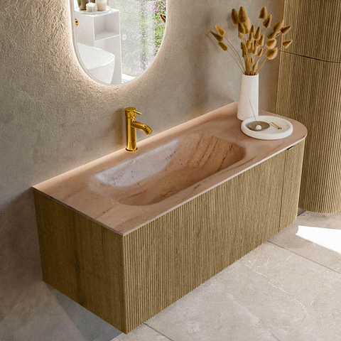 La combinaison de la forme arrondie sur le côté droit et du jeu de lignes horizontales épurées du meuble crée une apparence douce et accueillante. La couleur Dusk de la gamme bois apporte une atmosphère naturelle et chaleureuse qui donne immédiatement plus de caractère à votre salle de bains, sans être criarde. La façade à nervures verticales ajoute davantage de profondeur et de texture, conférant à l’ensemble un véritable look design, comme on en voit dans les hôtels de luxe et les intérieurs haut de gamme. Grâce à sa forme de base rectangulaire aux coins arrondis, ce meuble s’harmonise à merveille avec des robinets modernes, des miroirs ronds et des accessoires minimalistes. Vous créez ainsi facilement un style de salle de bains cohérent dans lequel tout est parfaitement assorti.