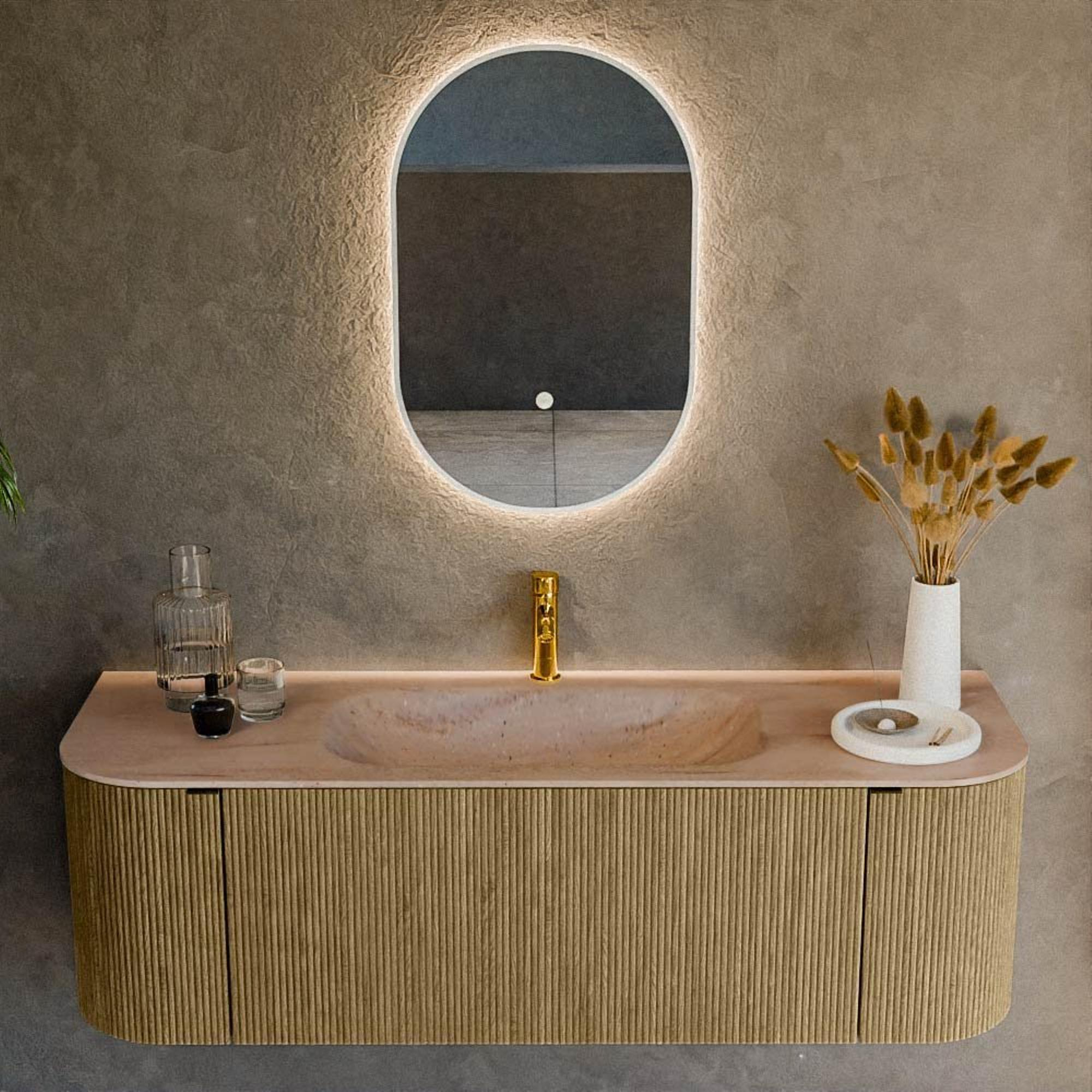Les formes arrondies à la fois sur le côté gauche et le côté droit confèrent à ce meuble de salle de bains une apparence particulière, presque organique. Pas d’angles vifs contre lesquels vous cogner, mais une façade fluide qui apporte de la sérénité dans la pièce. La couleur Dusk fait partie de la gamme bois et s’accorde parfaitement avec des carreaux clairs, un effet béton comme avec des accents plus foncés. Grâce à la façade nervurée verticale, il se crée un joli jeu de lumière et d’ombre, ce qui donne au meuble de la profondeur et du caractère. Ainsi, votre lavabo n’est pas seulement un élément fonctionnel, mais un véritable point de mire qui définit le style de toute votre salle de bains.