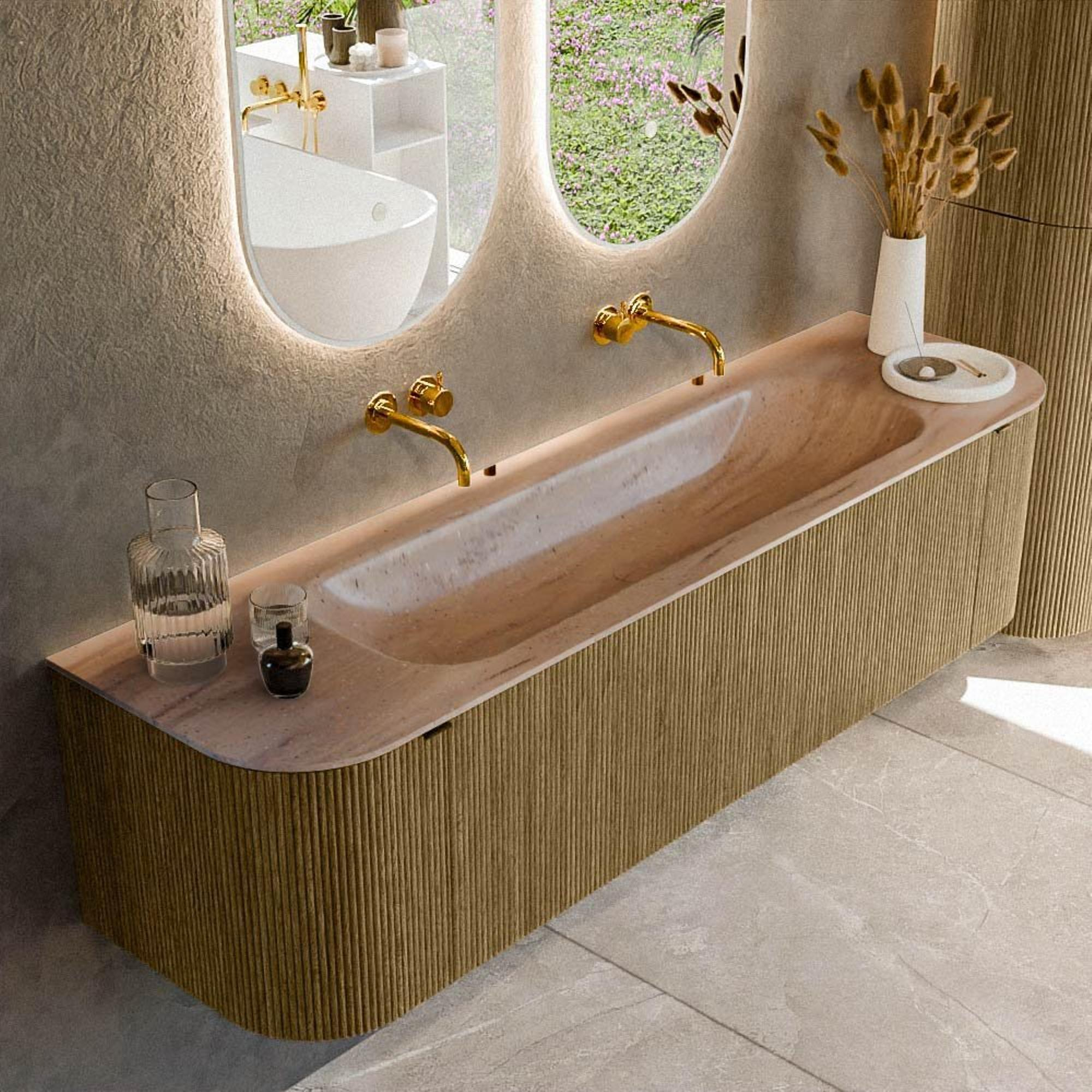 La forme avec des angles arrondis et une courbe subtile à gauche et à droite donne à ce meuble de salle de bains un caractère élégant, presque organique. Pas de lignes dures, mais une apparence douce qui apporte immédiatement de la sérénité à la pièce. La couleur bois Dusk et la façade à rainures verticales apportent plus de profondeur et de texture, de sorte que le meuble n’a jamais l’air ennuyeux, même dans une salle de bains minimaliste. Les façades sans poignées avec système push-to-open renforcent le look luxueux et épuré : vous ne voyez que de beaux matériaux et des lignes, sans poignées perturbatrices. Grâce à la largeur généreuse de 170 cm, le meuble se remarque vraiment comme une pièce de design, tout en conservant une forme douce qui s’intègre bien aussi bien dans les salles de bains modernes et scandinaves que dans les salles de bains style hôtel chic.