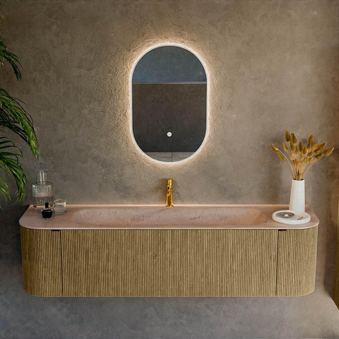 Les angles arrondis et la courbure élégante confèrent à ce meuble une apparence accueillante et luxueuse. La couleur Dusk avec structure bois paraît chaude et naturelle, sans être chargée ni criarde. Vous pouvez ainsi la combiner facilement aussi bien avec des carreaux effet béton sobres qu’avec une décoration murale marquée. La structure à nervures verticales sur les façades crée un jeu d’ombres intéressant et donne immédiatement à votre salle de bains une allure design. Comme le meuble est fixé flottant au mur, le sol reste bien visible et l’espace paraît plus grand et plus aéré – un grand atout, surtout pour les petites salles de bains. Vous créez ainsi avec un seul meuble un ensemble élégant et harmonieux dont vous profiterez pendant de nombreuses années.