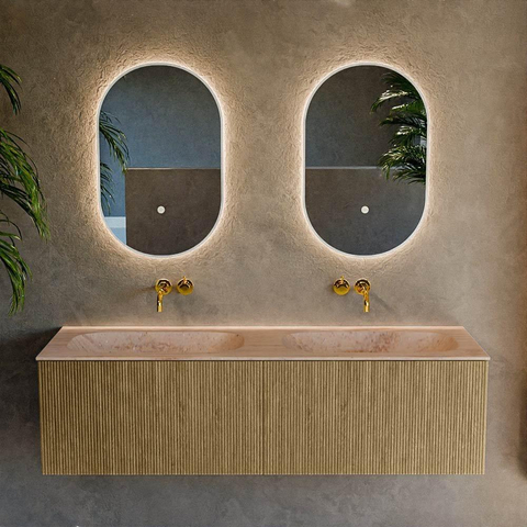 Avec ce système de meuble généreux, vous créez en une seule fois une base calme et luxueuse dans la salle de bains. La combinaison du large meuble de 150 cm avec deux tiroirs spacieux et du lavabo double épuré est idéale pour ceux qui partagent quotidiennement la salle de bains avec plusieurs personnes, tout en souhaitant conserver une vue d’ensemble et du style. Grâce à la teinte bois chaleureuse et à la façade raffinée avec structure à nervures verticales, ce modèle s’intègre parfaitement dans les salles de bains modernes, d’inspiration hôtel chic et scandinave, mais aussi dans un aménagement plus intemporel et apaisant. La hauteur peu profonde de 40 cm et la profondeur de 46 cm en font en outre un choix astucieux pour les salles de bains de taille moyenne comme pour les plus grandes : vous gagnez beaucoup d’espace de rangement sans que la pièce paraisse surchargée. Le lavabo double sans trou de robinet est parfait si vous souhaitez choisir vous-même vos robinets à poser favoris et ainsi ajouter une touche personnelle.
