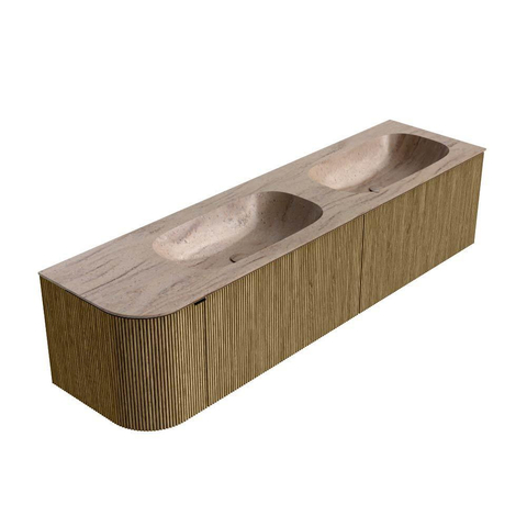 La combinaison du meuble Dusk avec façade nervurée et du lavabo Saba offre une apparence chaleureuse et haut de gamme qui donne immédiatement un effet design à votre salle de bains. Les façades sont réalisées dans une teinte bois avec structure verticale, ce qui ajoute profondeur et texture et joue joliment avec la lumière. Ce look bois s’accorde parfaitement avec les styles d’intérieur populaires tels que moderne, Japandi et hôtel chic. Le lavabo en solid surface présente un aspect épuré et minimaliste, avec des angles doux qui s’accordent parfaitement à la forme arrondie du meuble. Le subtil arrondi à gauche rompt les lignes droites de l’espace, ce qui rend l’ensemble plus doux et plus accueillant. Vous faites ainsi entrer chez vous un meuble non seulement pratique, mais qui peut aussi devenir véritablement la pièce maîtresse de votre salle de bains.