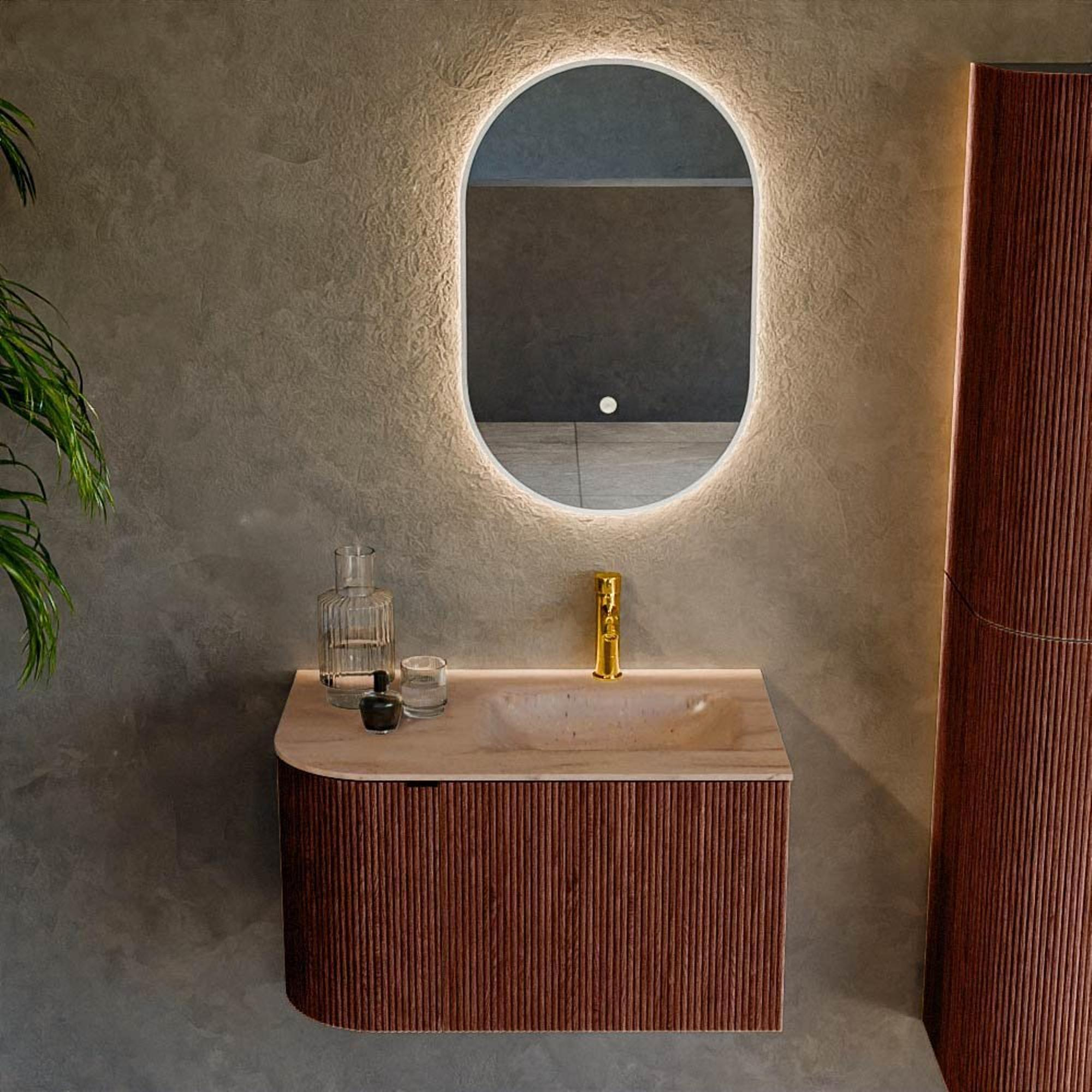 La teinte profonde Ruby confère immédiatement à votre salle de bains une ambiance haut de gamme, presque digne d’un hôtel. En combinaison avec les angles arrondis et la subtile courbe à gauche, le meuble paraît doux et élégant, sans perdre en sobriété. La façade rainurée avec texture verticale offre une profondeur supplémentaire et un aspect luxueux, ce qui permet au meuble de se marier aussi bien avec des carreaux neutres et sobres qu’avec des couleurs marquées. Comme le lavabo est positionné à droite, cette configuration convient parfaitement aux salles de bains où l’arrivée d’eau ou le miroir se trouve de ce côté. Vous créez ainsi un ensemble réfléchi qui n’est pas seulement agréable à regarder, mais aussi logique à utiliser.