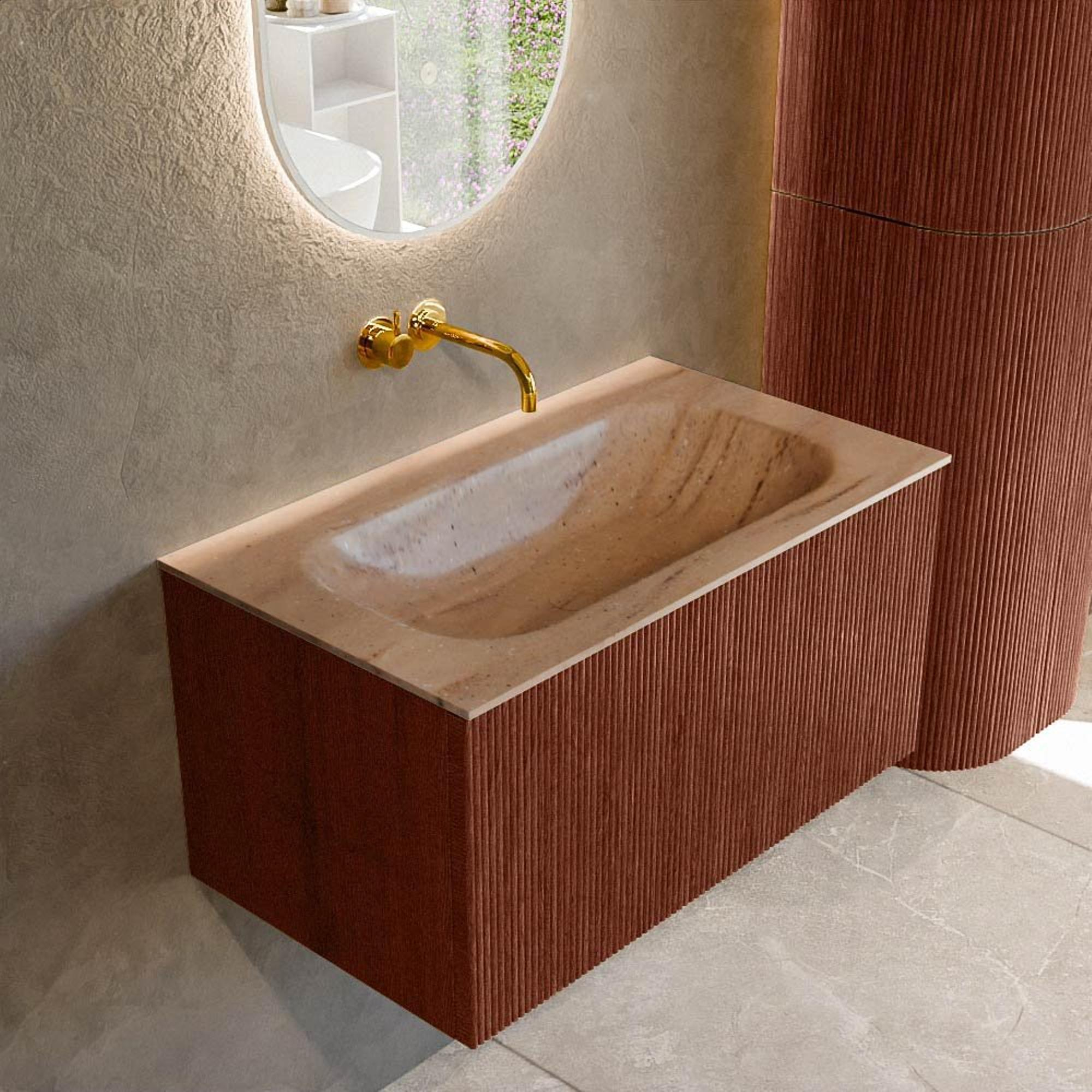 La couleur Ruby profonde combinée à la façade à rainures verticales donne immédiatement à votre salle de bains une allure luxueuse, presque comme une boutique-hôtel. Le meuble devient un véritable accroche-regard, sans être criard. La structure à rainures apporte profondeur et nuances à la façade, ce qui permet de capter joliment la lumière et de rendre la couleur encore plus riche. Surtout en combinaison avec des carreaux sobres ou des murs neutres, vous créez ainsi un contraste chaleureux. Si vous recherchez un meuble de salle de bains qui va plus loin que le « simple blanc » et qui donne à votre salle de bains une touche personnelle et audacieuse, alors cette teinte rouge chaleureuse est un excellent choix. De plus, le meuble se marie très bien avec des robinets et des accessoires noirs, dorés ou en métal brossé, ce qui vous permet de créer facilement un ensemble cohérent.