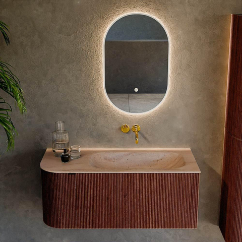 La chaude couleur Ruby fait de ce meuble de salle de bains le point de mire de votre salle de bains. La façade nervurée verticale avec effet 3D lui confère une allure luxueuse, presque comme un véritable meuble, donnant ainsi immédiatement à votre salle de bains une ambiance d’hôtel haut de gamme. Le côté gauche arrondi adoucit l’ensemble et crée une ligne élégante le long du mur. Le design se prête parfaitement aux salles de bains modernes et design, mais peut également trouver magnifiquement sa place dans un style plus éclectique ou boutique. Associez par exemple la teinte rouge profonde à des carreaux clairs et des accessoires noirs ou en laiton pour un contraste puissant, ou au contraire à des tons de bois chauds pour une apparence plus douce et chaleureuse. Comme le meuble est monté au mur, le sol paraît plus spacieux et vous gardez la salle de bains claire et aérée.