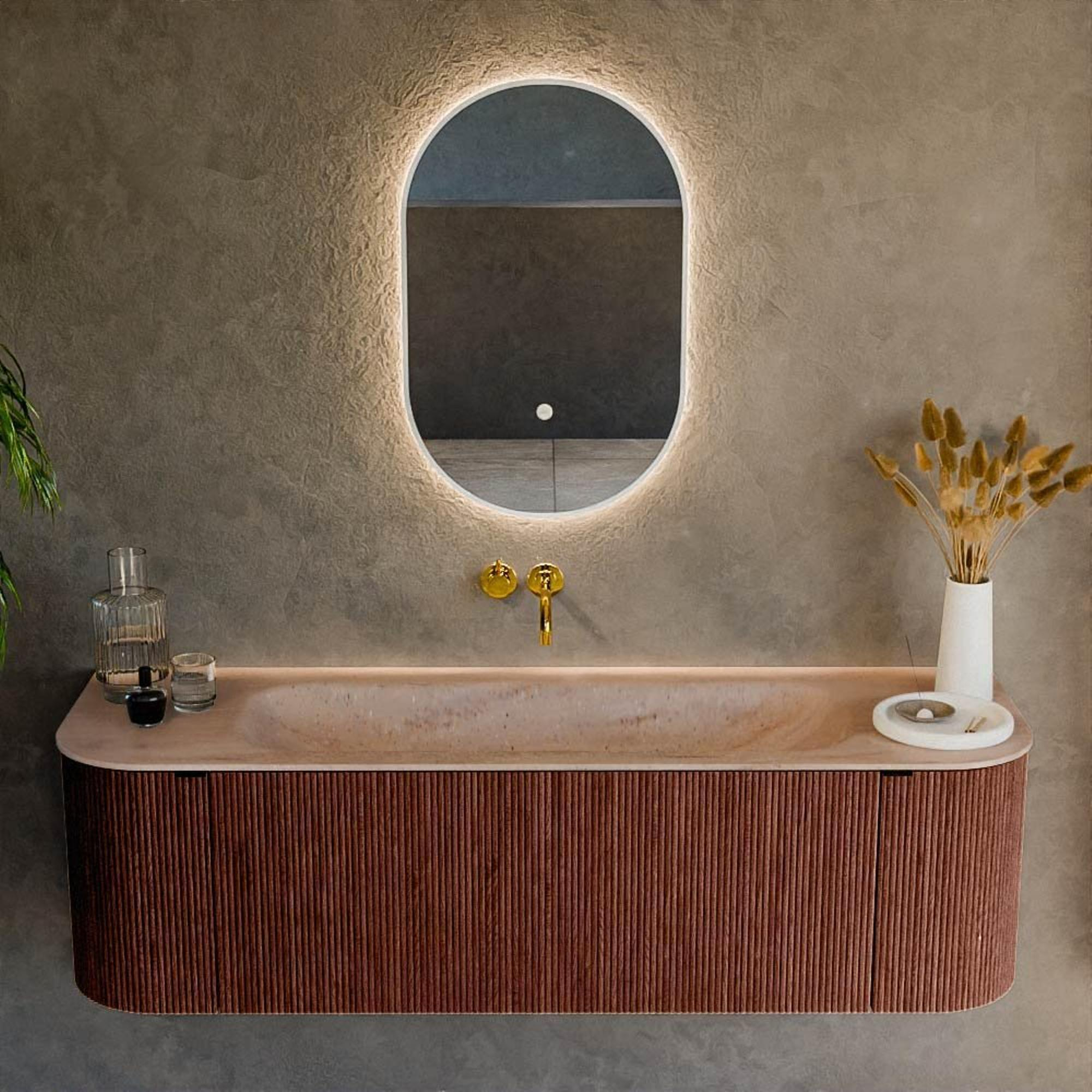 Les courbes subtiles à gauche et à droite rendent ce meuble particulièrement accueillant dans l’espace. Pas d’angles vifs le long du passage, mais des lignes fluides qui donnent à votre salle de bains une apparence plus douce. La couleur Ruby attire le regard sans être criarde : un rouge profond et chaleureux qui se marie à merveille avec des carreaux neutres, des robinets noirs ou chromés et des matériaux naturels comme le bois et la pierre. La structure à nervures verticales sur la façade renforce la sensation de luxe et ajoute davantage de profondeur au design. Ce meuble est ainsi particulièrement adapté comme pièce maîtresse dans une salle de bains moderne de style hôtel ou dans un intérieur où vous aimez retrouver de la couleur et de la personnalité sans faire de concessions à une élégance intemporelle.