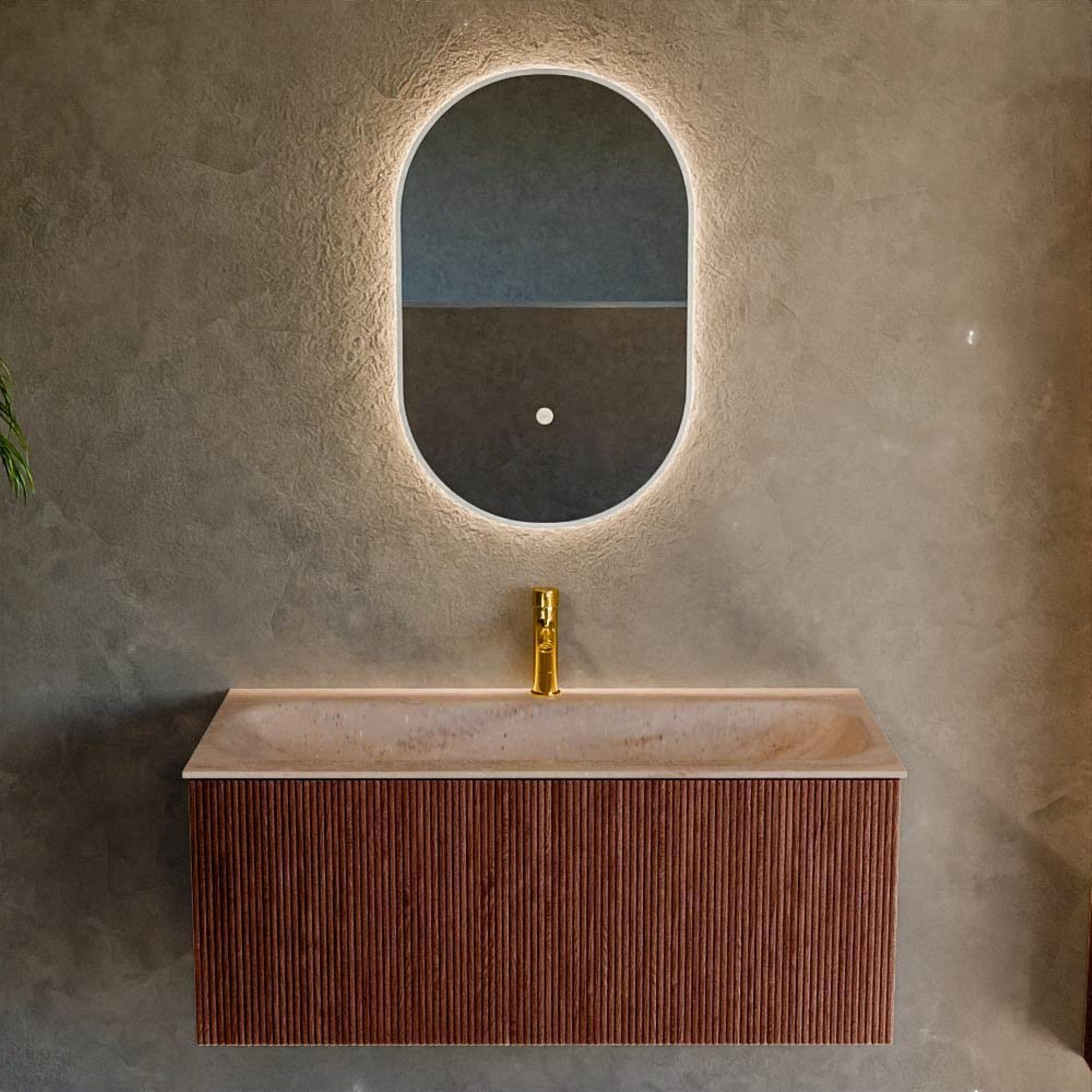 La teinte chaude Ruby combinée à la façade nervurée verticale donne immédiatement à votre salle de bains une ambiance d’hôtel haut de gamme. La structure de la façade crée un jeu de lumière ludique et rompt les lignes épurées de la pièce, sans donner une impression chargée. Ce meuble se prête parfaitement aux combinaisons avec des robinets noirs, dorés ou en inox, mais aussi avec des carreaux clairs ou un aspect béton pour un contraste élégant. La structure nervurée 3D ajoute de la profondeur et du caractère, ce qui fait de ce meuble bien plus qu’un simple placard : il devient le point central de la conception de votre salle de bains. Vous créez ainsi, avec un seul produit, une déclaration de style claire, tout en gardant un intérieur calme et harmonieux.