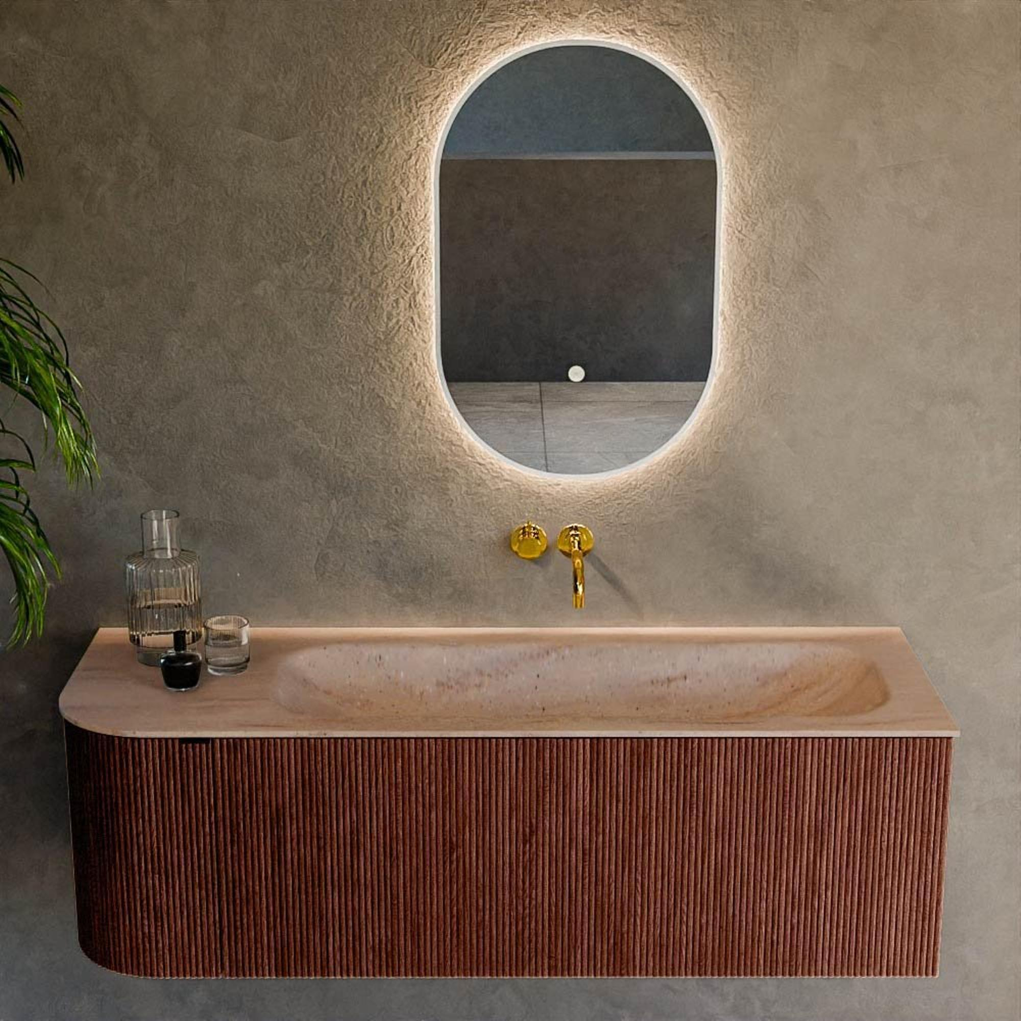 Vous recherchez un meuble de salle de bains luxueux, à la fois pratique et remarquablement élégant ? Cette version généreuse de 135 cm de large avec arrondi sur le côté gauche est idéale pour les salles de bains de taille moyenne à spacieuse où vous souhaitez combiner un design épuré avec beaucoup d’espace de rangement. La couleur Ruby profonde et chaleureuse donne immédiatement à votre intérieur une allure exclusive, tandis que le plan vasque en solid surface dans la teinte Saba offre une base apaisante et moderne. Grâce à l’aménagement astucieux avec un large tiroir et une porte, vous pouvez ranger de manière ordonnée tous vos indispensables quotidiens de salle de bains, des serviettes aux produits de soin. La vasque à droite sans trou de robinet vous offre en outre toute la liberté de choisir vous-même un joli mitigeur surélevé ou de laisser sortir le robinet du mur, parfait si vous souhaitez créer un véritable statement design.