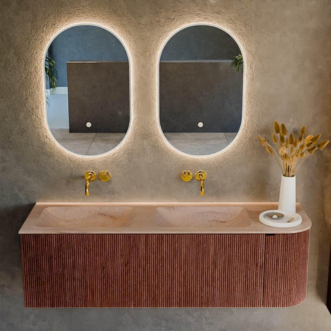 MONDIAZ KURVE-DLUX 145cm badmeubel ronding Rechts kleur Ruby met 1 lade en 1 deur. Wastafel LEAF Dubbel / Links zonder kraangat Saba.