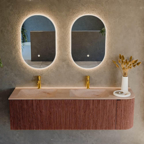La forme arrondie sur le côté droit donne immédiatement à ce meuble une apparence douce et organique qui se distingue des ensembles de meubles plus traditionnels et rectilignes. La couleur Ruby est une teinte rouge-brun profonde qui ajoute chaleur et luxe à votre salle de bains, sans être criarde. Combinée à la façade rainurée verticale, elle crée un jeu de lignes raffiné qui fonctionne à merveille avec un éclairage indirect et de grands carreaux muraux ou de sol. Comme le meuble est fixé en suspension au mur, il paraît léger et spacieux malgré sa grande largeur. Cela le rend particulièrement adapté aux salles de bains design où vous souhaitez créer une ambiance d’hôtel chic, mais aussi aux intérieurs de style scandinave ou minimaliste dans lesquels vous recherchez juste un peu plus de caractère.