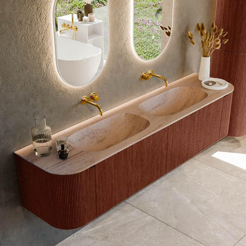 Avec ses façades arrondies et sa profonde couleur Ruby, ce meuble de salle de bains est un véritable accroche-regard dans la salle de bains. La courbe douce à la fois du côté gauche et du côté droit rompt les lignes dures et confère une apparence luxueuse et haut de gamme. La structure nervurée verticale sur les façades ajoute une profondeur et une texture supplémentaires, ce qui permet au meuble d’apporter immédiatement de l’atmosphère même dans une salle de bains minimaliste. Grâce à sa largeur généreuse de 190 cm, le meuble s’exprime pleinement contre un grand plan de toilette ou un large mur, et vous créez une ambiance de salle de bains d’hôtel chez vous. Combinez-le avec des accessoires noirs, en laiton ou de couleur chrome pour donner à la teinte Ruby une orientation de style différente à chaque fois : d’une atmosphère chaude et hôtel-chic à un style épuré et moderne.