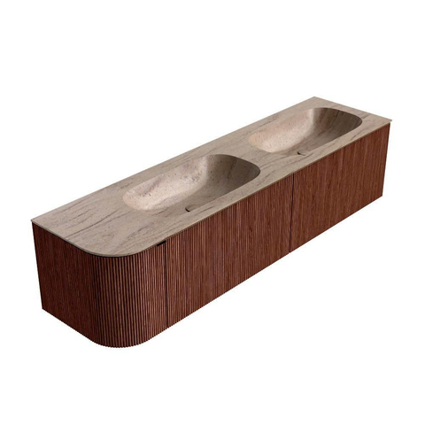 Le léger arrondi sur le côté gauche donne à ce meuble sa ligne douce caractéristique et le rend immédiatement adapté aux salles de bains où chaque centimètre compte. Vous profitez d’un espace de circulation supplémentaire au niveau du passage, tandis que le plan est utilisé de manière optimale sur toute la largeur. La forme rectangulaire aux angles arrondis offre un aspect moderne et pourtant intemporel, ce qui vous permet de combiner ce meuble sans effort avec différents styles, du chic hôtelier au style scandinave chaleureux. Le double lavabo intégré couleur Saba s’accorde parfaitement avec le meuble et crée un aspect calme et homogène, sans vasques posées ni bords où la saleté peut s’accumuler. Si vous recherchez un meuble de salle de bains un peu différent des modèles standard rectilignes, tout en conservant un aspect épuré, ce design correspondra parfaitement à vos attentes.