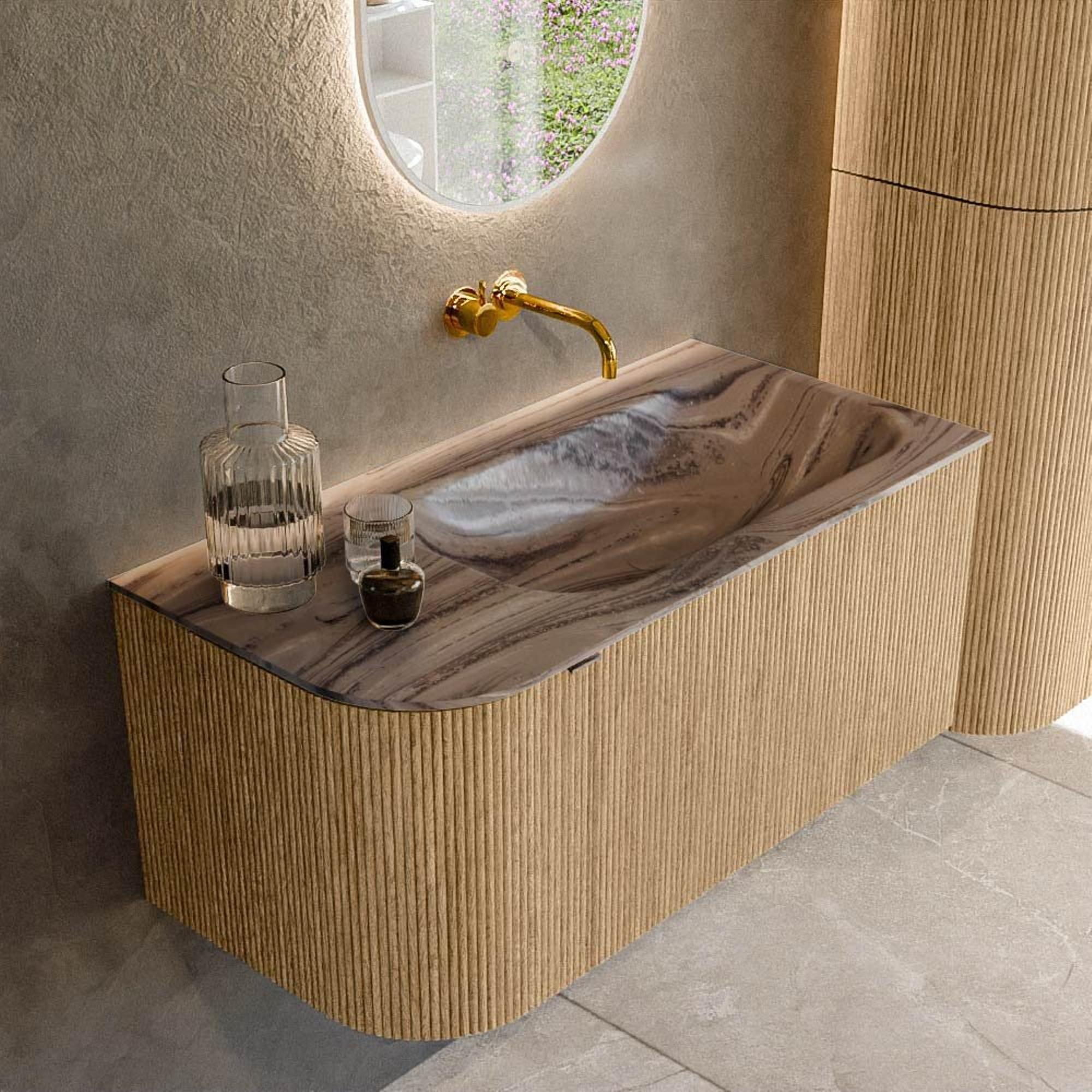 MONDIAZ KURVE-DLUX 95cm badmeubel ronding Links kleur Oak met 1 lade en 1 deur. Wastafel BIG SMALL Rechts zonder kraangat Sombra.