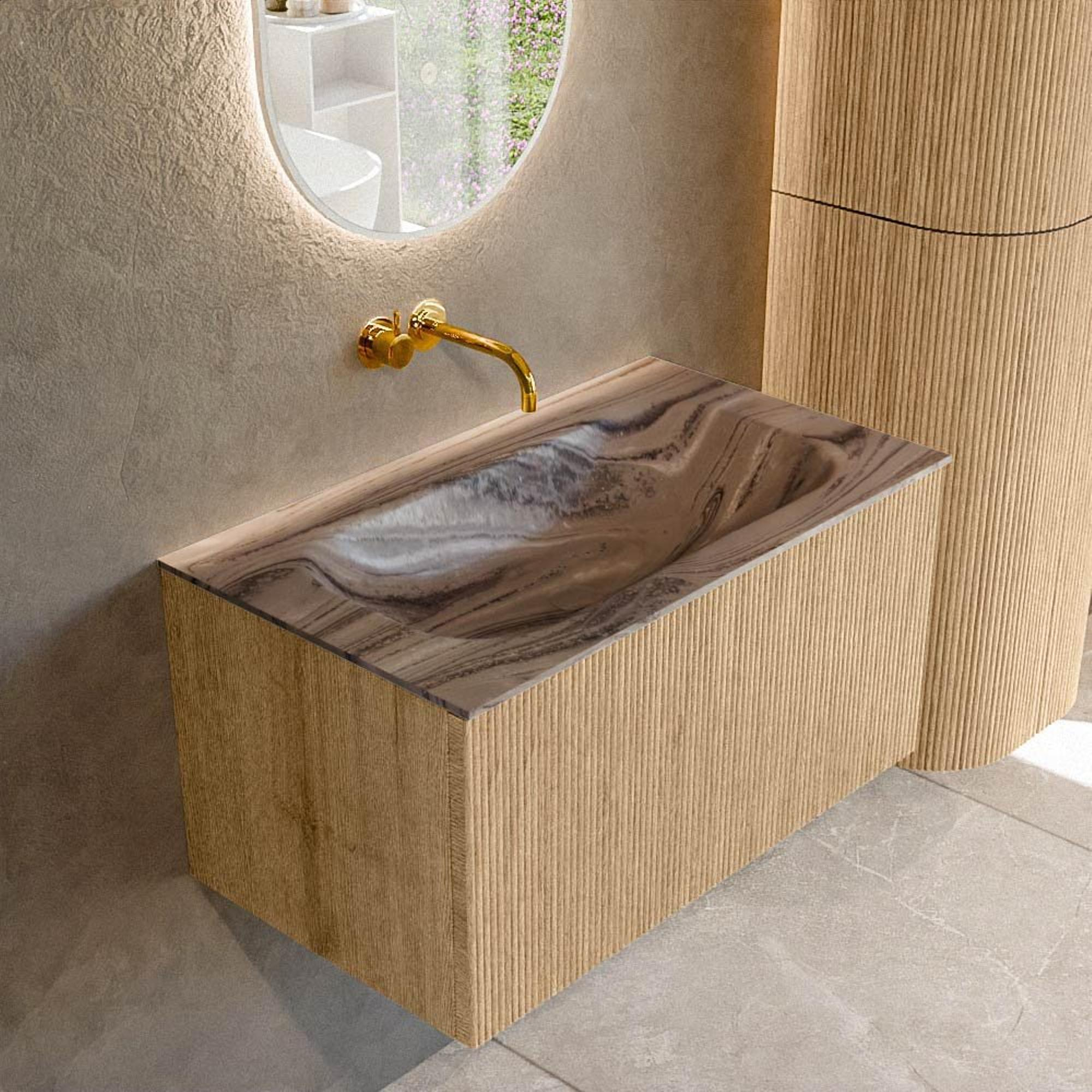 MONDIAZ KURVE-DLUX Meuble de salle de bains 80 cm couleur Oak avec 1 tiroir et 0 porte. Lavabo BIG SMALL Central sans trou de robinet Sombra.