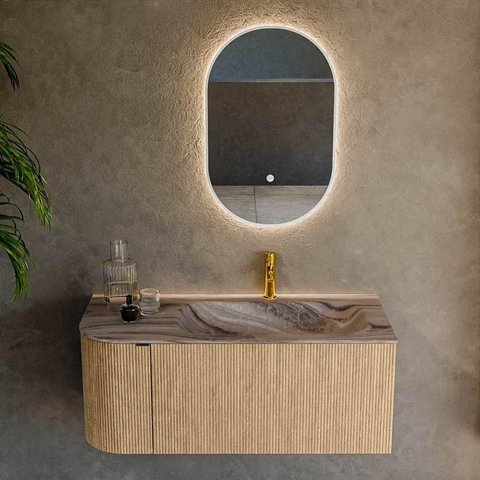 La combinaison de la couleur Oak avec la forme arrondie sur le côté gauche confère à ce meuble une apparence douce et accueillante, sans rien perdre de son côté moderne. La structure verticale nervurée sur la façade apporte une profondeur et un luxe supplémentaires, ce qui fait immédiatement ressentir votre meuble de salle de bains comme un objet de design dans la pièce. La forme rectangulaire aux angles arrondis paraît moins massive qu’un bloc strict, ce qui est un grand avantage surtout dans les salles de bains plus petites ou plus chargées. Le plan vasque contrasté dans la couleur Sombra crée un jeu élégant entre clair et foncé, qui s’accorde parfaitement avec les tendances actuelles de la salle de bains utilisant des matériaux naturels, des carreaux effet béton ou des accents noirs.