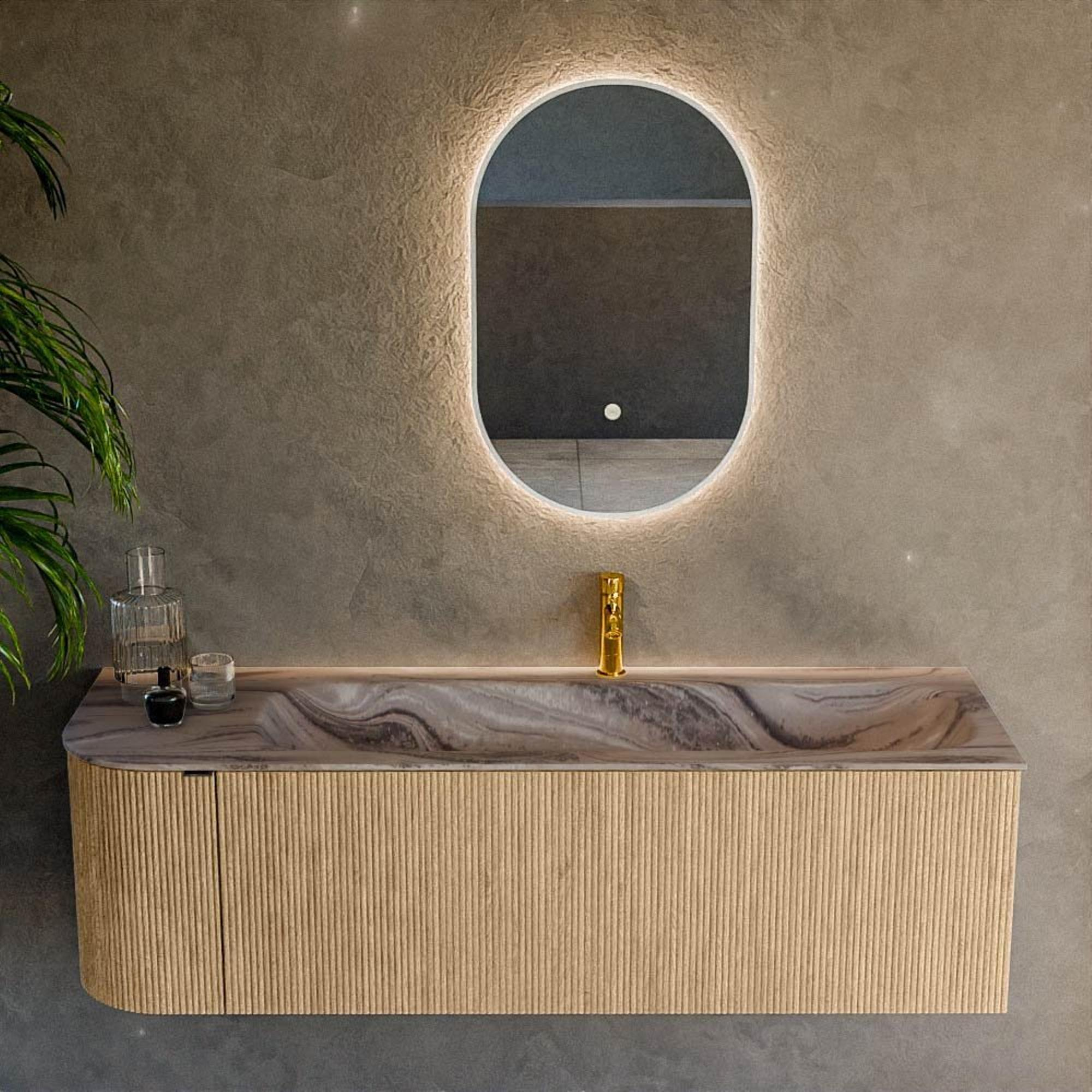 La couleur chêne et la façade rainurée verticale confèrent à ce meuble une apparence luxueuse et design que l’on retrouve habituellement surtout dans les intérieurs haut de gamme. Le léger arrondi sur le côté gauche adoucit les lignes droites et rend l’ensemble agréable à l’œil, mais aussi pratique dans un passage, car aucun angle vif ne dépasse. La texture à l’avant apporte davantage de profondeur et de caractère, tandis que les lignes épurées et la finition sans poignées permettent au meuble de s’intégrer parfaitement dans des salles de bains modernes, industrielles ou scandinaves. Associez-le à des robinets et accessoires noirs mats, en métal brossé ou justement de couleur chrome pour adapter entièrement le style à vos goûts.