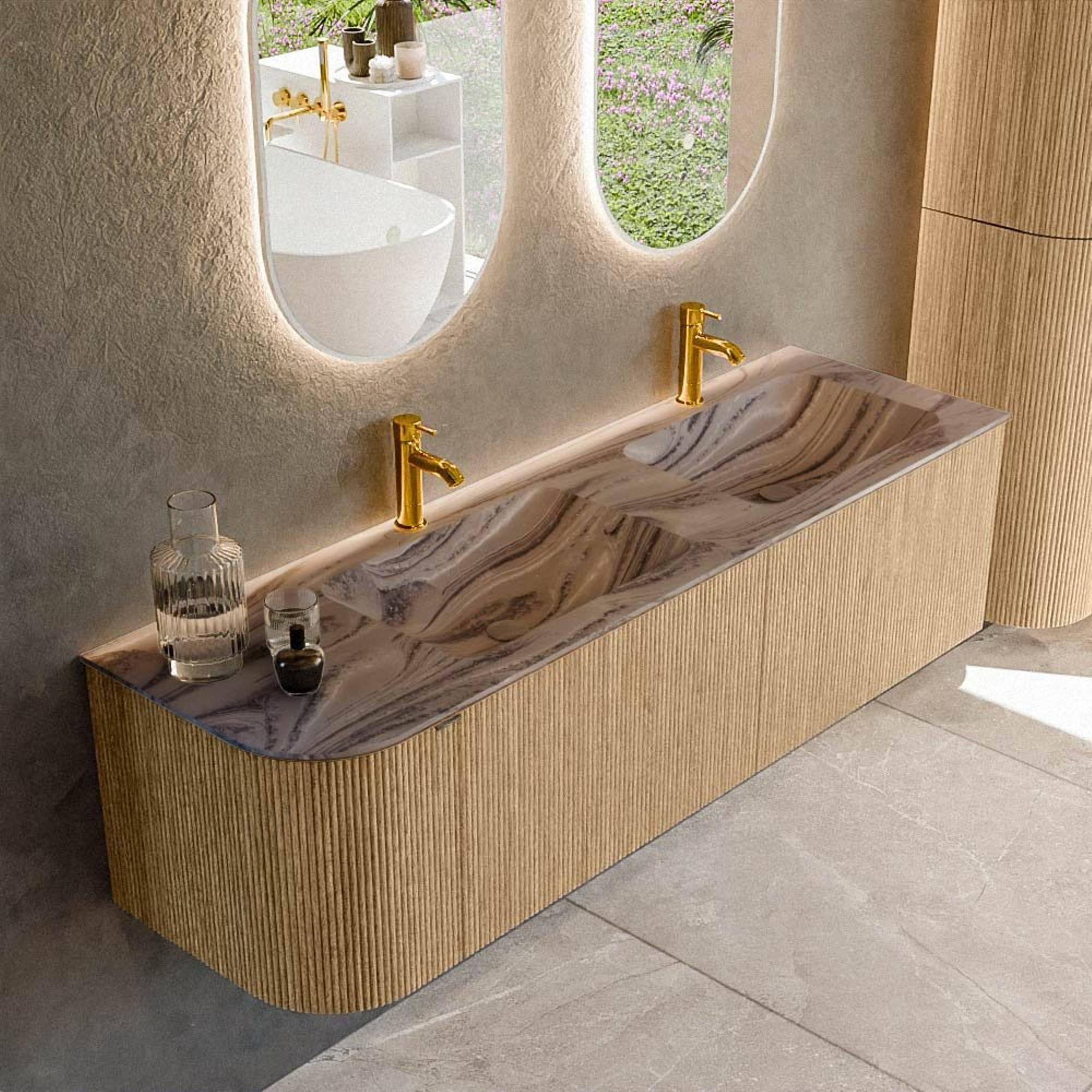 MONDIAZ KURVE-DLUX 155cm meuble de salle de bains arrondi gauche couleur Oak avec 2 tiroirs et 1 porte. Lavabo LEAF Double / droite 2 trous de robinet Sombra.