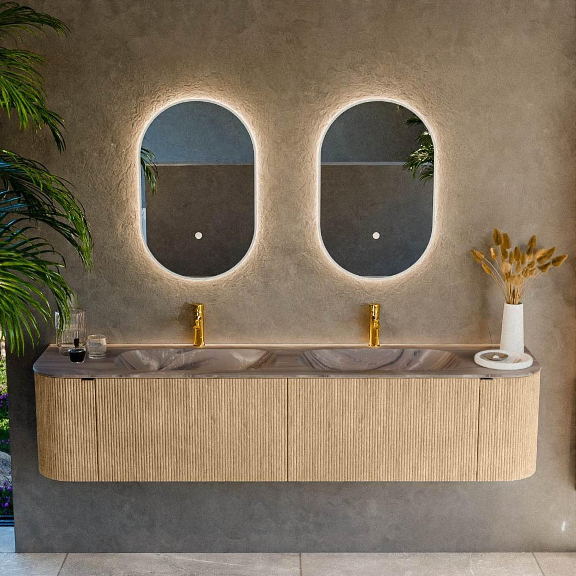 Vous recherchez un meuble de salle de bains généreux qui n’est pas seulement pratique, mais qui apporte aussi véritablement chaleur et atmosphère à votre salle de bains ? Ce meuble au look bois naturel et aux courbes élégantes convient particulièrement aux salles de bains de taille moyenne à grande, dans lesquelles vous aimez commencer ou terminer la journée à deux. Grâce au plan-vasque double, il y a suffisamment de place pour vous brosser les dents ou vous rafraîchir en même temps, tandis que la combinaison de tiroirs et de portes offre un espace de rangement clair pour toute la famille. Les angles arrondis adoucissent l’apparence et rendent l’ensemble chaleureux et moderne, ce qui s’accorde aussi bien avec une salle de bains design épurée qu’avec un style plus naturel et scandinave. Si vous aimez le confort, la facilité d’utilisation et un agencement bien réfléchi, cette solution est un choix judicieux pour une salle de bains que vous souhaitez ressentir chaque jour comme luxueuse et ordonnée.