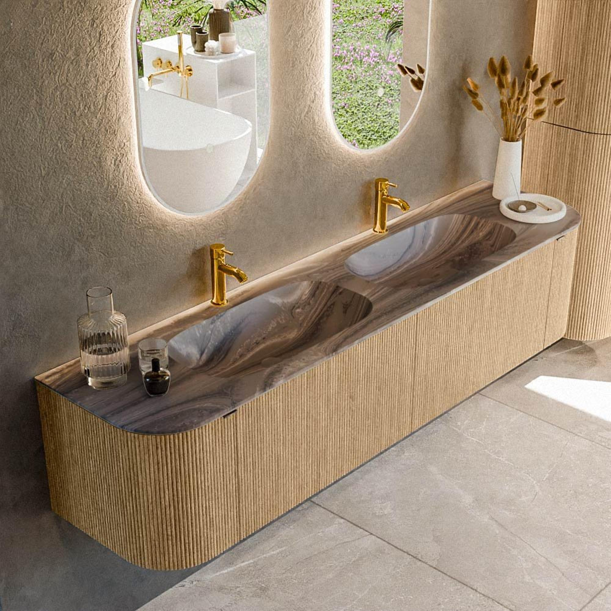 MONDIAZ KURVE-DLUX 190cm meuble de salle de bains arrondi gauche + droite couleur chêne avec 2 tiroirs et 2 portes. Plan-vasque STOR SMALL double 2 trous de robinet Sombra.