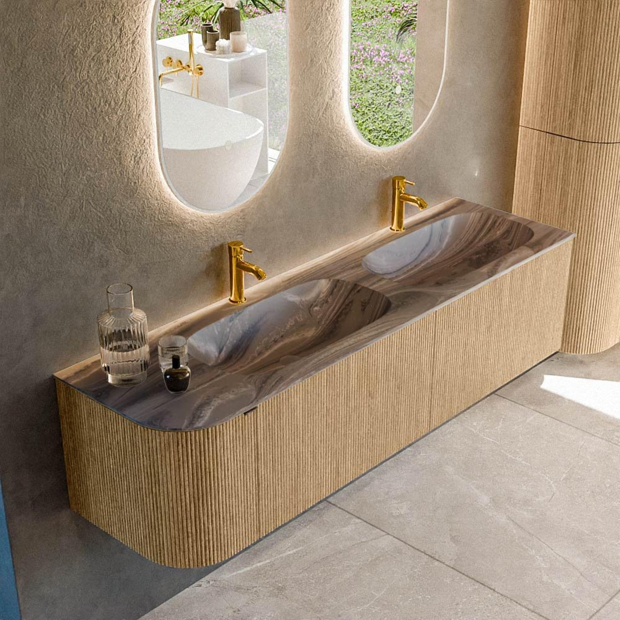 La courbe marquante sur le côté gauche confère à ce meuble une allure ludique et luxueuse et adoucit les lignes de votre salle de bains. Surtout le long d’un passage ou en face d’une douche, la forme arrondie fait apparaître l’ensemble plus accueillant et spacieux. La couleur chêne, combinée à une façade à rainures verticales, apporte immédiatement chaleur et texture à la pièce, ce qui fonctionne parfaitement dans un concept de salle de bains moderne ou hôtel chic. Comme le meuble est monté au mur, le sol reste dégagé et l’espace paraît plus grand et plus aéré. La couleur Sombra du lavabo crée un contraste élégant avec le bois et donne à votre salle de bains cette touche design supplémentaire, sans être criarde.