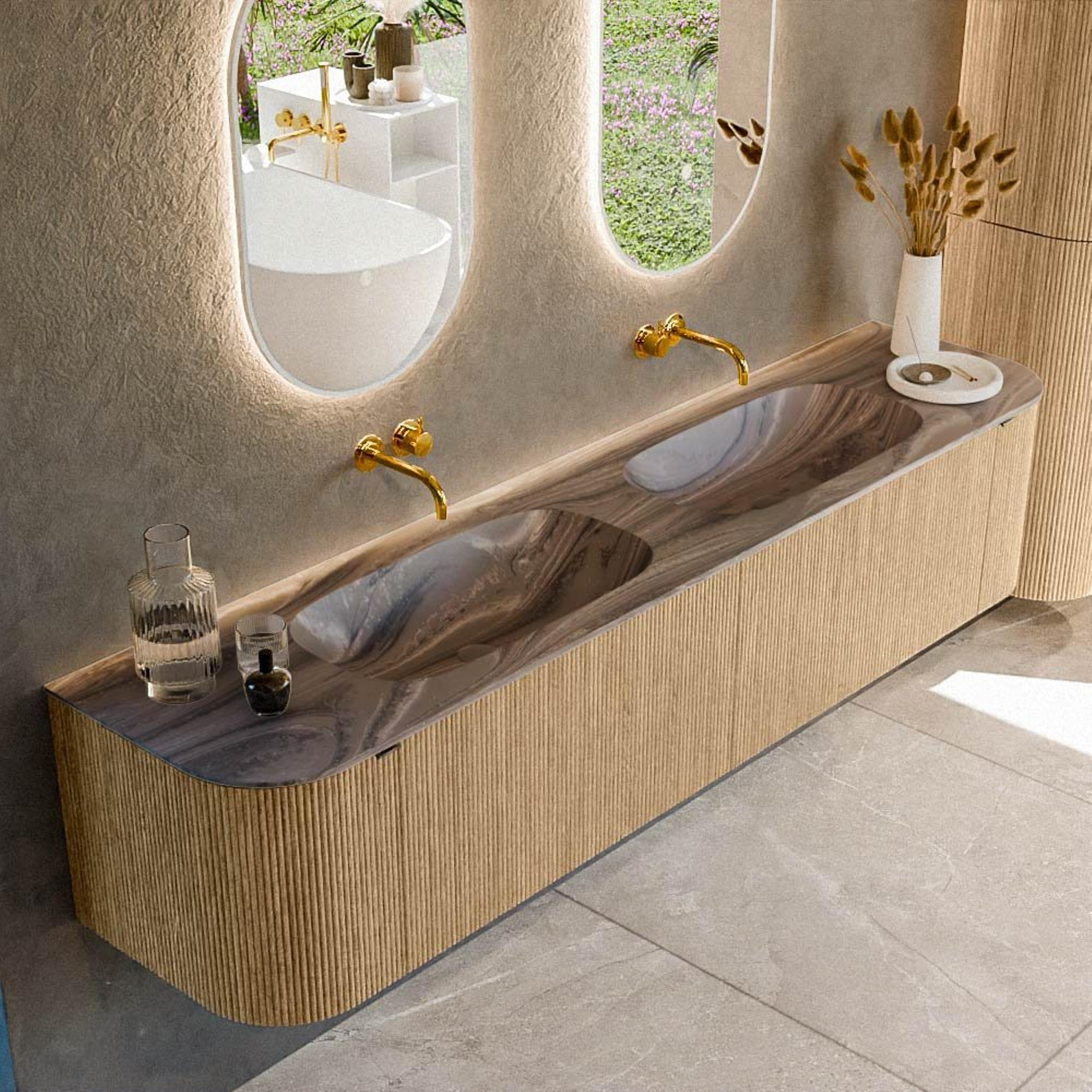 La largeur de 200 cm et l’agencement astucieux avec 2 tiroirs et 2 portes vous offrent un espace de rangement étonnamment vaste. Dans les tiroirs, vous rangez les affaires utilisées au quotidien comme les brosses à dents, le maquillage et les accessoires de rasage, tandis que derrière les portes vous pouvez facilement stocker de grands flacons, des serviettes ou des réserves. Le double lavabo rend la routine du matin et du soir bien plus détendue : vous avez chacun votre propre espace, sans bousculade ni objets qui traînent. Comme le plan-vasque ne comporte pas de trous de robinet, vous déterminez vous-même l’emplacement des robinets, par exemple sous forme de mitigeurs posés sur le plan ou encastrés dans le mur. Vous créez ainsi un ensemble de lavabo personnalisé et luxueux, parfaitement adapté à votre mode de vie.