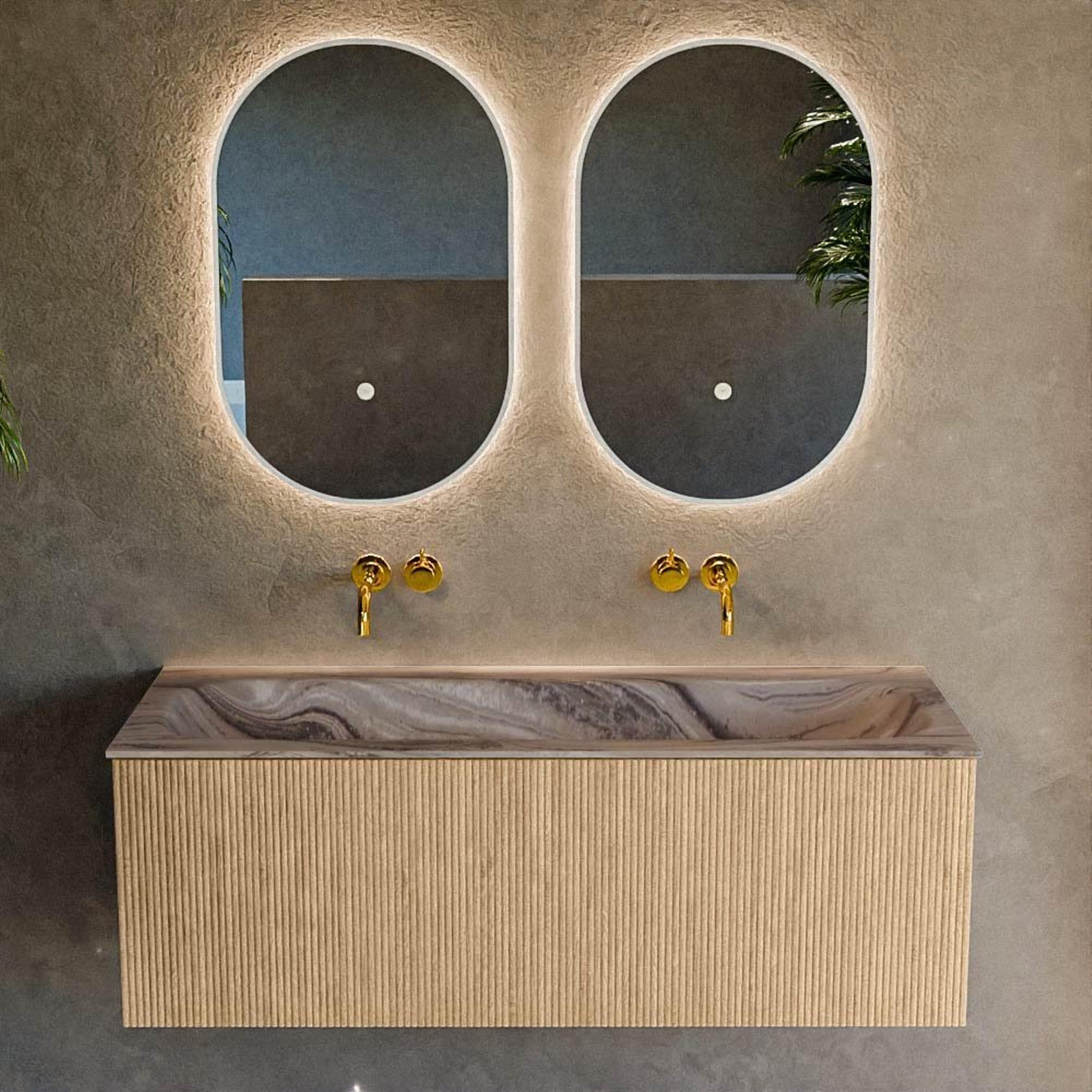 La couleur oak du meuble apporte immédiatement chaleur et ambiance à votre salle de bains, tandis que le lavabo en solid surface mat, au look épuré, dans la couleur Sombra, ajoute justement cette sensation moderne d’hôtel. Les lignes droites et la façade cannelée à structure verticale créent un look architectural luxueux qui se marie bien avec des robinets et accessoires noirs, en laiton brossé ou finition chromée. Grâce à la largeur de 120 cm, vous disposez d’un meuble généreux qui devient un véritable accroche-regard aussi bien dans les salles de bains de taille moyenne que dans les plus grandes, sans être exagérément présent. Le large lavabo central n’est pas seulement esthétique, mais aussi pratique : vous bénéficiez d’une agréable zone de rinçage spacieuse avec, à gauche et à droite, suffisamment d’espace de dépose pour le savon, le parfum ou la décoration.