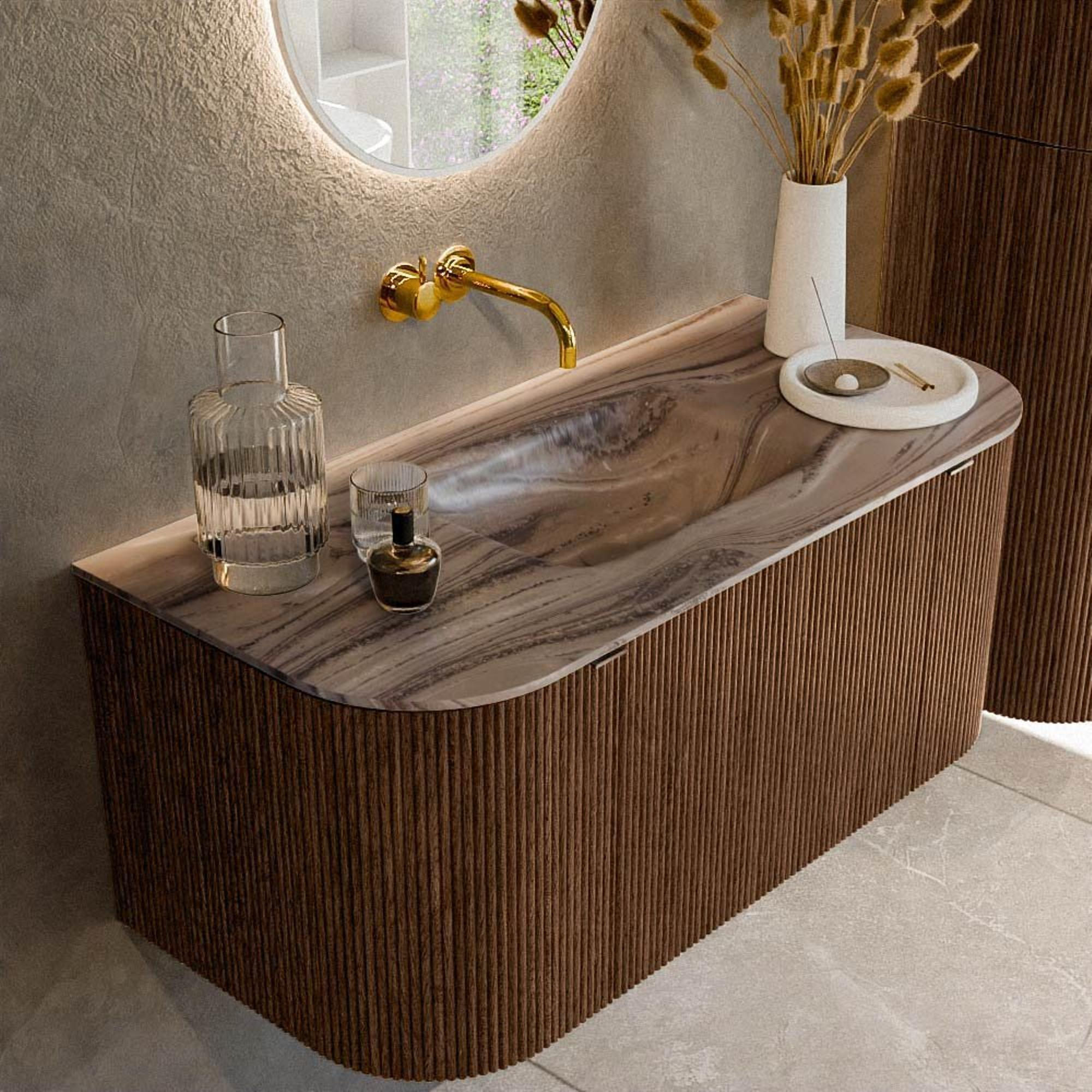 La forme arrondie, aussi bien sur le côté gauche que sur le côté droit, ne crée pas seulement une silhouette élégante, mais offre également une sensation plus douce et plus sûre à l'usage, en particulier dans les petites salles de bains ou avec des enfants. La couleur noyer avec structure nervurée verticale sur les façades donne immédiatement à votre salle de bains une apparence luxueuse, semblable à un meuble, plutôt qu'un simple aspect sanitaire standard. Comme la vasque est intégrée sans joint dans le plan et placée au centre, l'ensemble paraît apaisé avec une belle symétrie. Cette combinaison de teinte bois, d'angles arrondis et de surface de vasque plane et épurée correspond parfaitement aux tendances actuelles de la salle de bains et se marie facilement avec des robinets et accessoires noirs, inox ou chromés.