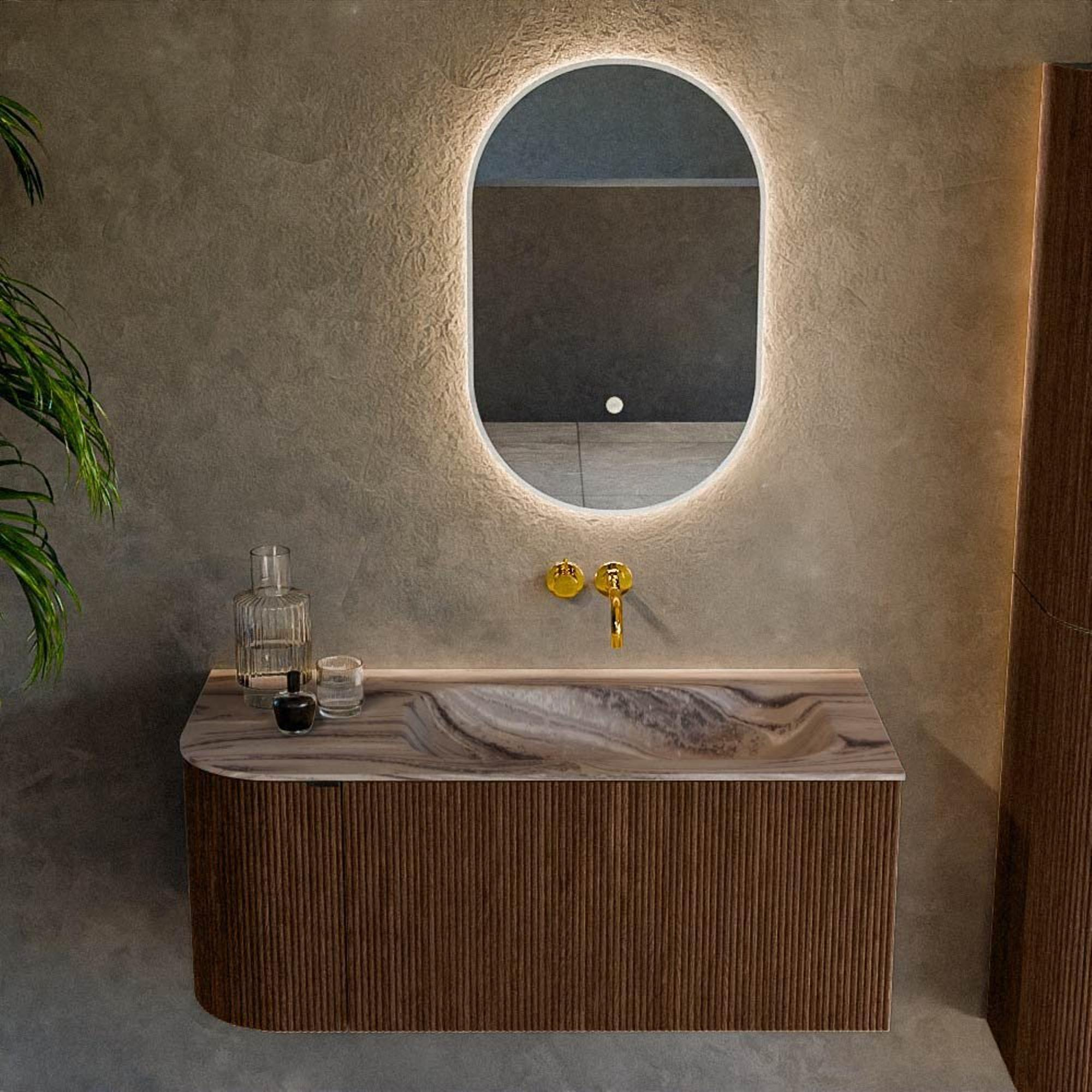 La forme arrondie sur le côté gauche confère à ce meuble une ligne particulièrement fluide, faisant disparaître les angles vifs et donnant à votre salle de bains une impression de calme et d’espace. La structure verticale à rainures sur la façade crée une apparence luxueuse, digne d’un véritable meuble, et fait magnifiquement ressortir le décor bois. La couleur Walnut s’accorde parfaitement avec les tendances populaires de la salle de bains telles que l’hôtel chic, le style scandinave chaleureux et le moderne industriel. Comme le meuble est monté en suspension au mur, l’ensemble paraît léger et laisse un espace pratique pour le nettoyage sous le meuble. Vous ne faites donc pas seulement entrer un meuble de salle de bains fonctionnel dans votre intérieur, mais aussi un véritable élément phare qui donne immédiatement une apparence haut de gamme à votre salle de bains.