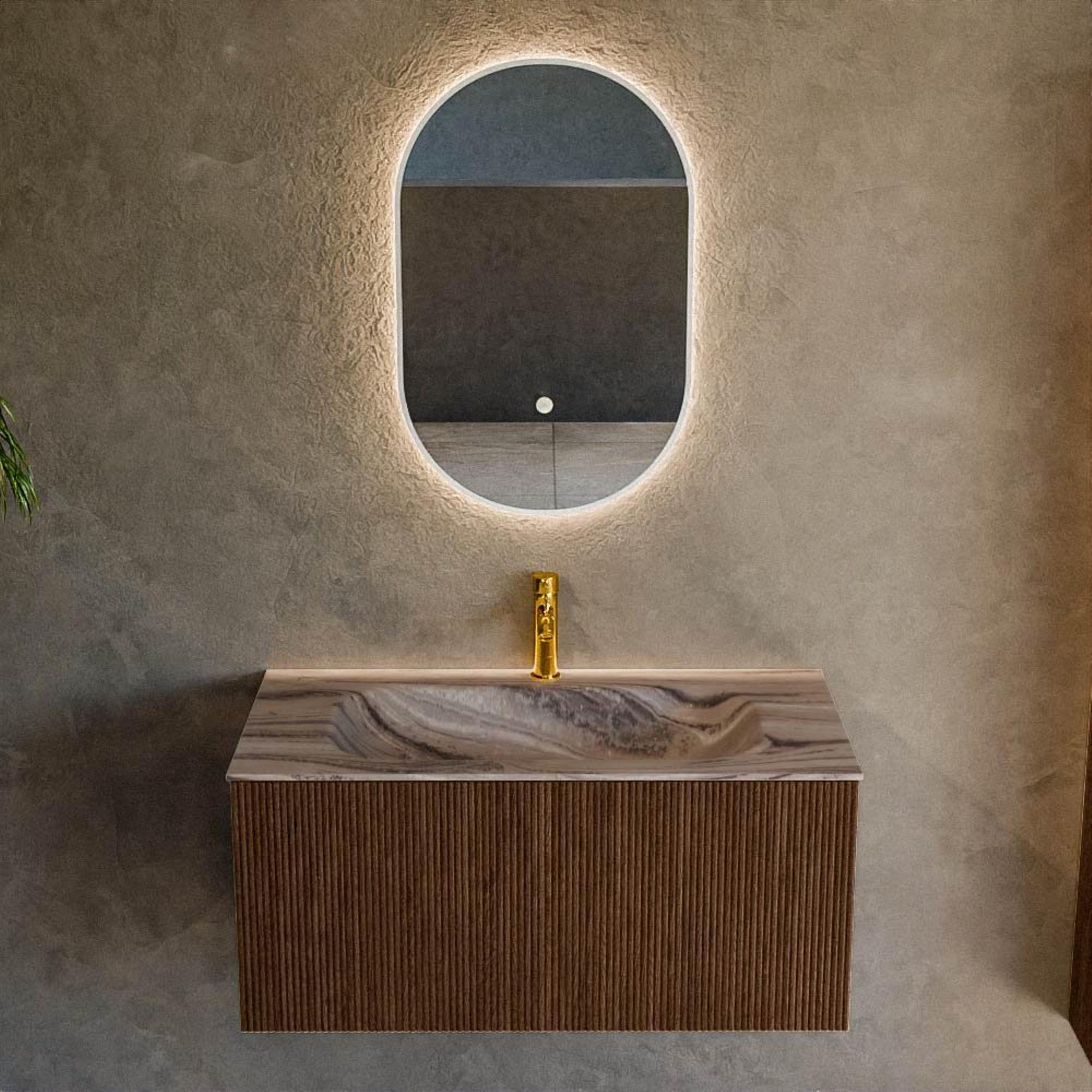 La couleur walnut et les façades à rainures verticales donnent immédiatement du caractère à ce meuble. La structure 3D rainurée sur les façades crée une apparence luxueuse, proche du mobilier, et casse subtilement la lumière, donnant ainsi plus de profondeur à votre salle de bains. La teinte bois chaude se marie à merveille avec des robinets et accessoires noirs, chromés ou en métal brossé, mais se combine également très bien avec des tons naturels doux et des carreaux beiges. Grâce au tiroir push-to-open sans poignée, la façade reste calme et épurée, sans interruptions, de sorte que l’attention se porte vraiment sur le beau veinage du bois. C’est un excellent choix si vous souhaitez créer une salle de bains qui évoque un spa reposant, tout en restant clairement personnelle et distinctive.