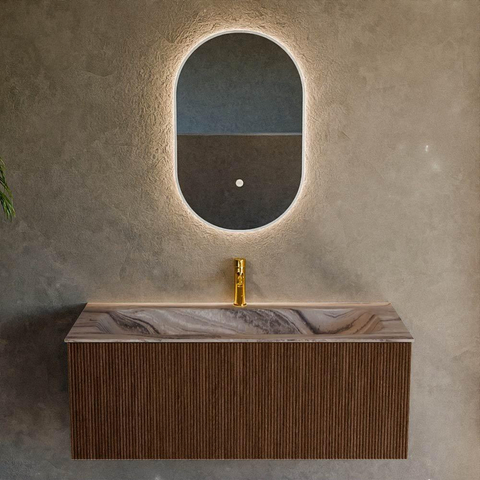 La combinaison de la teinte bois walnut avec le plan de lavabo clair Sombra crée un contraste chic qui évoque immédiatement une atmosphère d’hôtel de luxe. La façade à nervures avec texture verticale donne plus de profondeur et de caractère, faisant de ce meuble un véritable accroche-regard dans votre salle de bains. Comme le meuble est monté de façon suspendue au mur, l’espace paraît optiquement plus grand et le sol reste dégagé, ce qui est un grand avantage surtout dans les salles de bains de taille moyenne et compacte. Les formes arrondies du design s’harmonisent parfaitement avec les lignes douces de votre salle de bains, comme un miroir rond ou une paroi de douche arrondie, et rendent l’ensemble chaleureux et intemporel. Vous optez ainsi pour un meuble qui non seulement s’intègre parfaitement à votre intérieur maintenant, mais aussi dans quelques années.