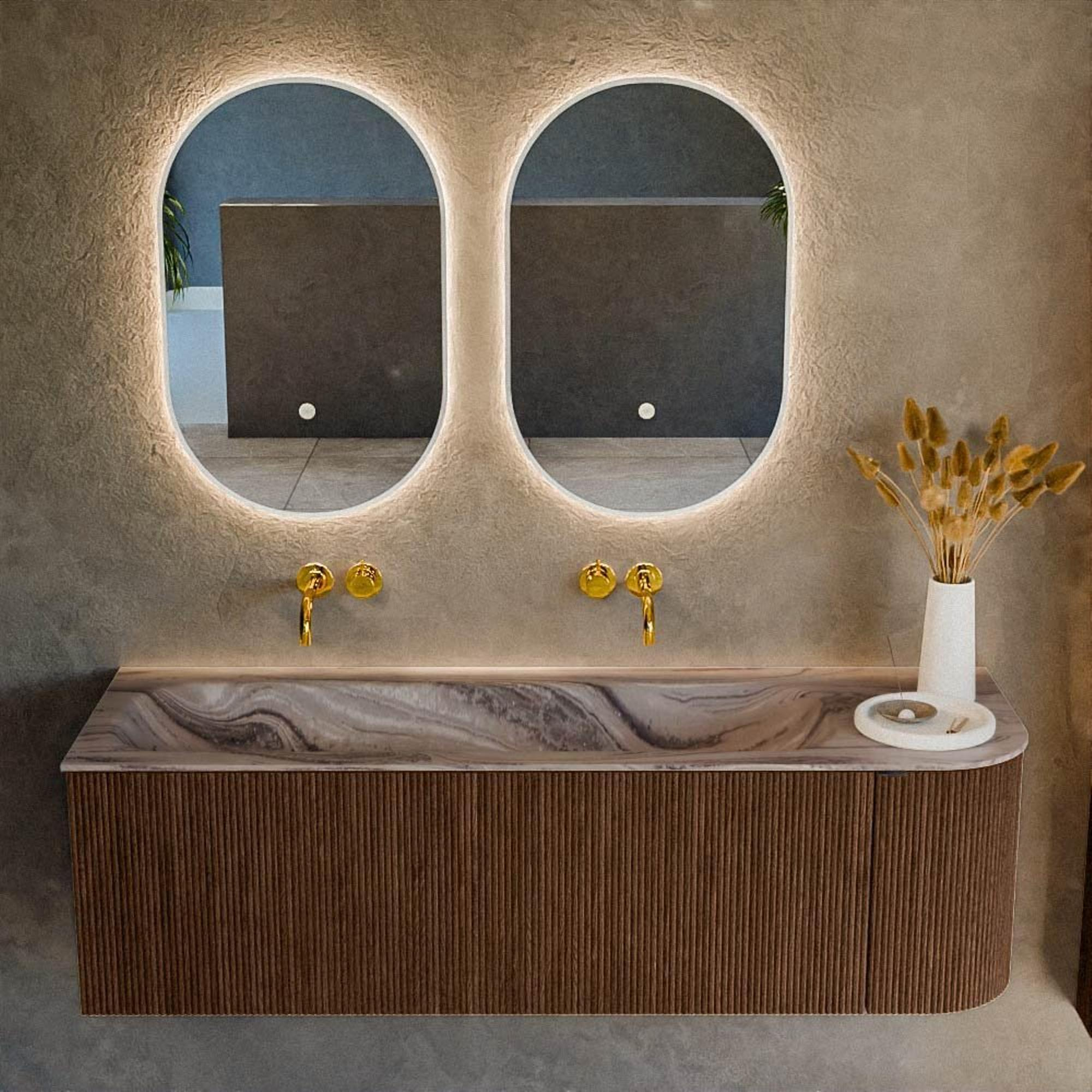 La couleur noyer et la texture rainurée verticale sur la façade confèrent un aspect riche et naturel avec beaucoup de profondeur. Cela s’accorde parfaitement avec des styles de salle de bains populaires tels que hôtel chic, moderne organique ou scandinave chaleureux. La vasque en Solid Surface de couleur Sombra ajoute un accent mat, épuré et haut de gamme. Ce matériau est réputé pour ses lignes nettes et son aspect sans joints, ce qui donne à l’ensemble une allure très raffinée. La forme rectangulaire aux angles arrondis s’aligne parfaitement sur le côté arrondi du meuble, créant ainsi un ensemble harmonieux. Combinez par exemple ce meuble avec des robinets noirs, gunmetal ou en inox pour une composition design complète.