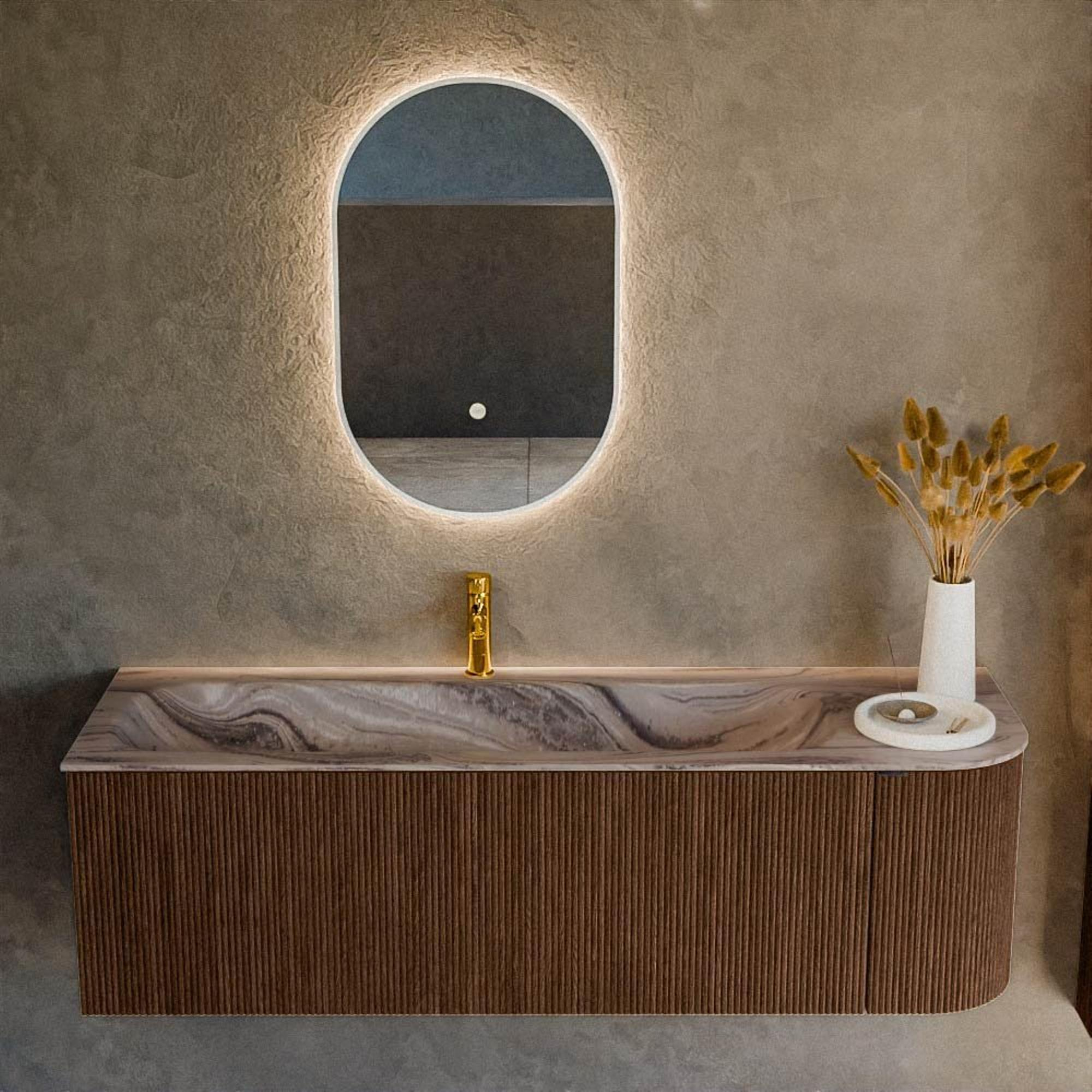 La teinte chaleureuse Walnut et la façade à lamelles verticales confèrent à ce meuble une apparence luxueuse et naturelle qui apporte immédiatement de l'ambiance. Le look bois se combine facilement avec des carreaux clairs comme avec des accents foncés, vous offrant ainsi une grande liberté dans la conception de votre salle de bains. Le meuble est doté d'une finition antibactérienne, ce qui contribue à un environnement de salle de bains hygiénique et simplifie l'entretien quotidien. Grâce au softclose, le tiroir se ferme toujours en douceur et sans bruit, ce qui n'est pas seulement agréable à l'usage, mais profite également à la longévité du meuble. Le lavabo en solid surface de couleur Sombra est épuré, moderne et facile à entretenir, ce qui vous permet de profiter longtemps de ce point de mire.