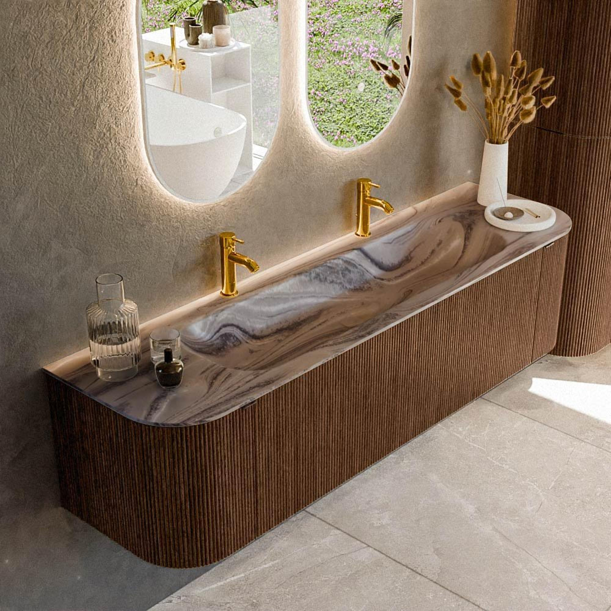Si vous recherchez un meuble de salle de bains spacieux qui combine chaleur, design et espace de rangement pratique, ce meuble est alors un choix judicieux pour votre salle de bains. Grâce à sa grande largeur, il est idéal pour une salle de bains familiale spacieuse, une salle de bains parentale luxueuse ou un espace élégant de style hôtel. L’association d’un ton bois avec un plan de toilette épuré en Solid Surface de couleur Sombra offre un aspect moderne mais intemporel, qui s’intègre aussi bien dans un style scandinave que dans une ambiance bien-être haut de gamme. Grâce à la vasque centrale avec deux trous de robinetterie, ce meuble est en outre parfait lorsque vous souhaitez utiliser le lavabo à deux en même temps, par exemple aux heures de pointe du matin. Le système d’ouverture par pression sans poignées (push-to-open) assure une façade épurée sans interruption, tandis que les formes arrondies et la structure rainurée à l’avant créent un effet architectural particulier. Vous faites ainsi entrer un véritable élément phare dans votre intérieur, sans faire de concessions sur la facilité d’utilisation au quotidien.