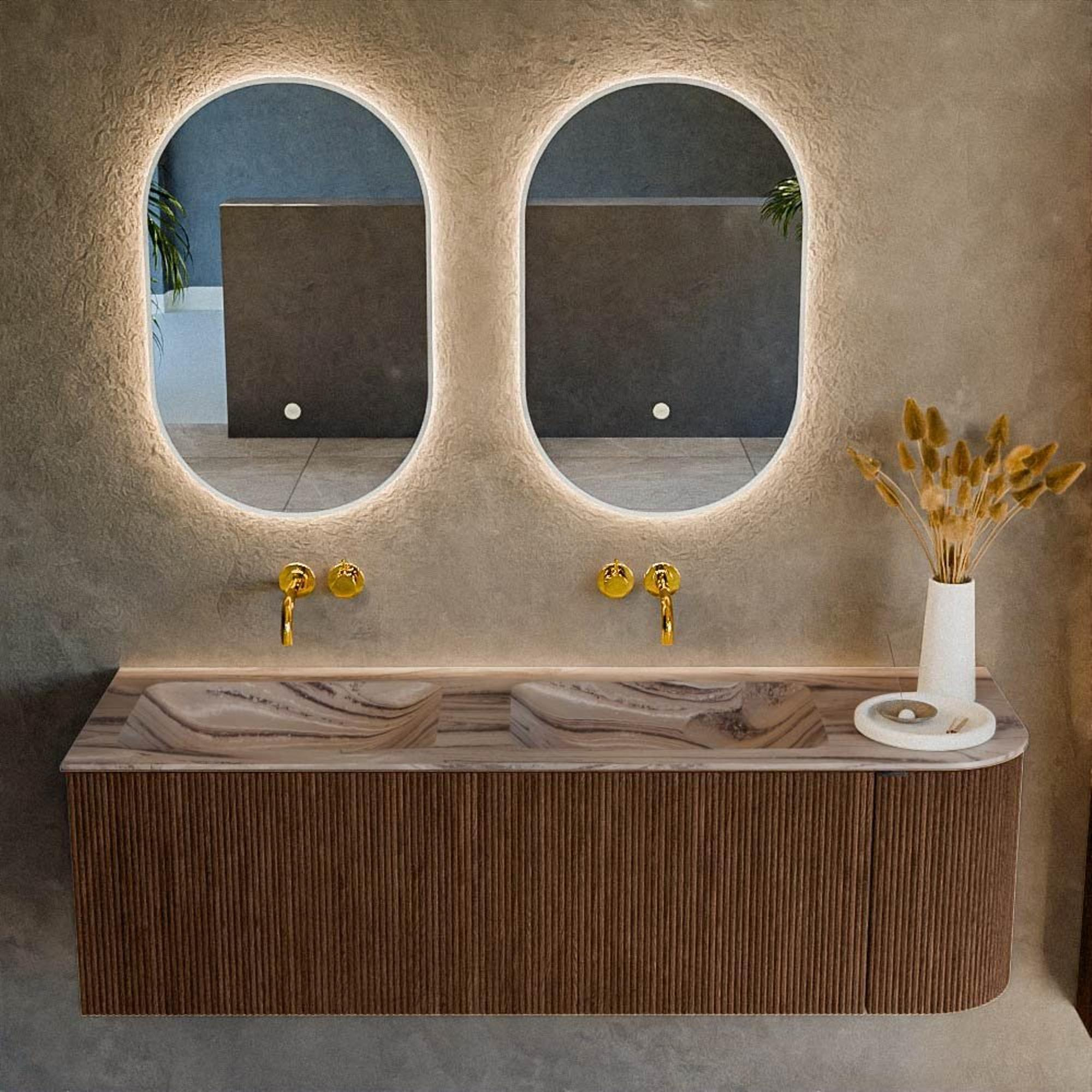 La couleur Walnut avec structure à rainures verticales sur les façades donne à ce meuble une apparence riche et élégante. La teinte bois apporte de la chaleur à la pièce et se combine parfaitement avec des carreaux blancs, gris ou foncés. Grâce au design épuré avec coins arrondis, l'ensemble paraît tout de même léger et moderne, idéal si vous souhaitez créer une atmosphère d'hôtel de luxe sans que votre salle de bains semble lourde ou chargée. La teinte bois appartient à la famille de couleurs « Bois », ce qui lui permet de bien s'accorder avec d'autres accents en bois tels qu'une étagère en bois, un miroir avec cadre en bois ou des accessoires dans des tons naturels. Grâce au système push-to-open, aucun bouton ni poignée n'est nécessaire : cela renforce le look minimaliste et assure un jeu de lignes calme et continu.