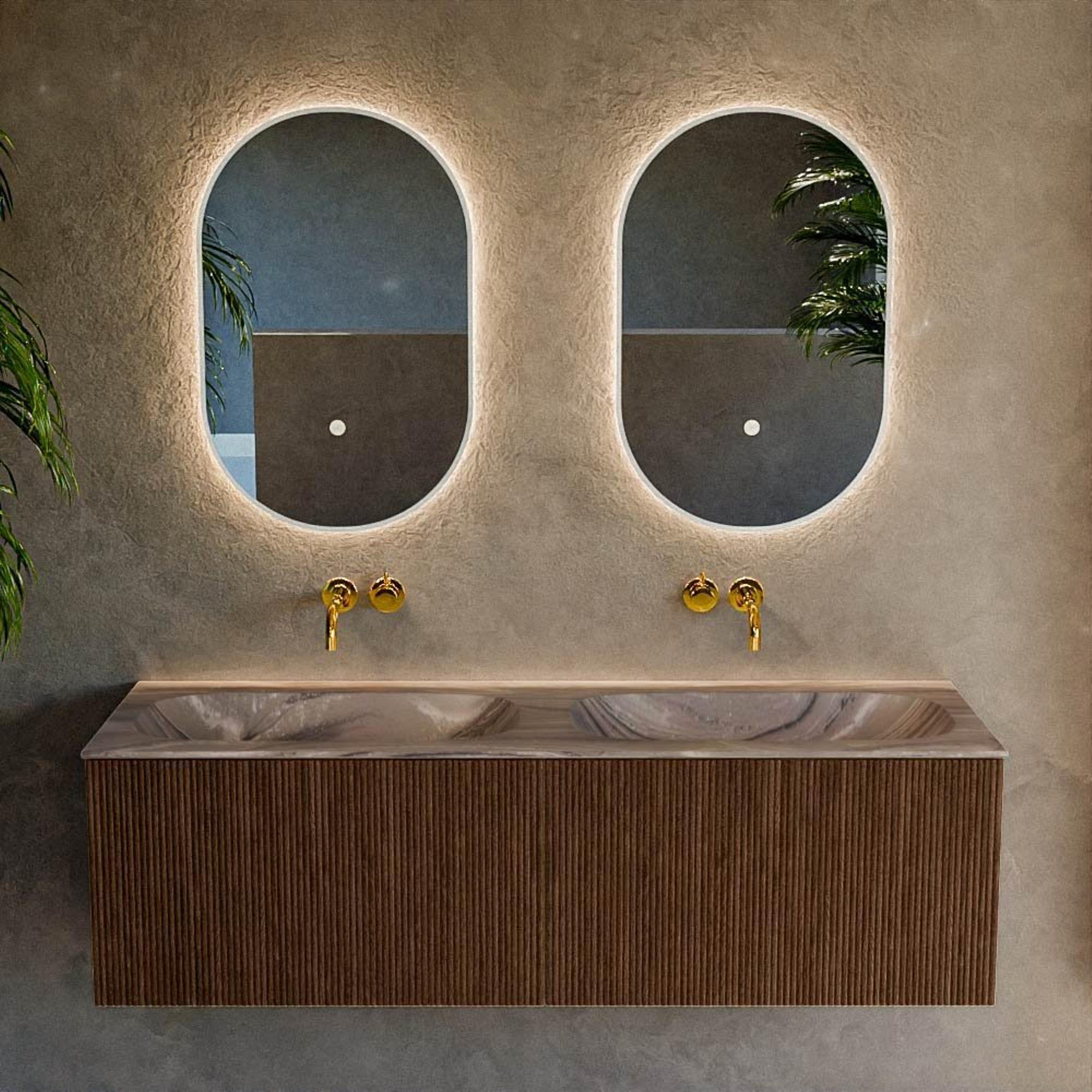 La teinte chaude Walnut apporte immédiatement de l’atmosphère à votre salle de bains et forme un beau contraste avec l’anthracite froid de la vasque. La façade à rainures verticales crée de la profondeur et de la texture, donnant au meuble une allure luxueuse et design sans être criard. Grâce à la couleur bois, ce meuble se combine facilement avec des robinets noirs, du métal brossé ou au contraire avec des carreaux blancs et clairs. Vous créez ainsi facilement une base calme et harmonieuse que vous trouverez belle pendant des années, même si vous changez d’accessoires ou de couleurs d’accent.