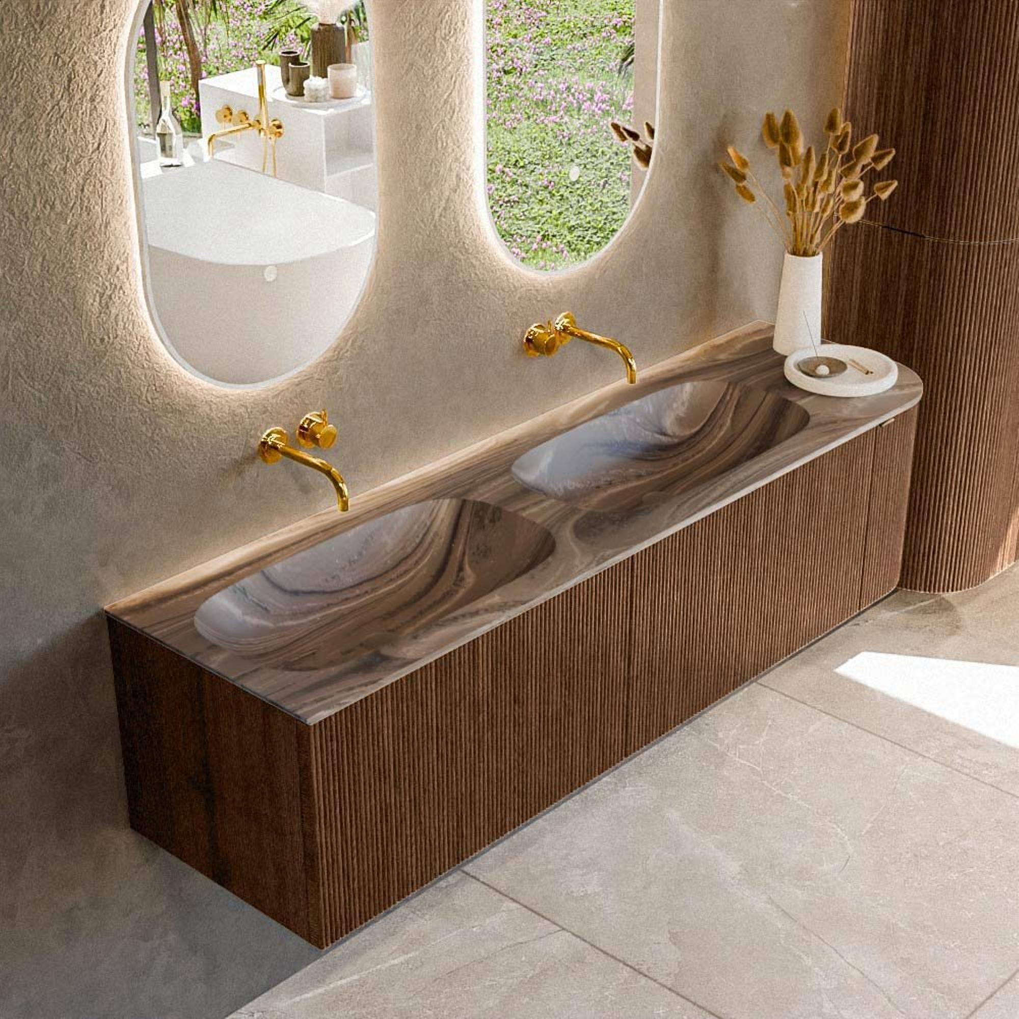 Avec ce meuble de salle de bains spacieux, vous optez pour une solution élégante et pratique pour la grande salle de bains ou la salle de bains familiale luxueuse. La largeur généreuse de 165 cm et le double lavabo le rendent idéal pour les matinées chargées où plusieurs personnes souhaitent utiliser le lavabo en même temps. Le côté arrondi à droite crée une ligne douce et élégante le long du passage, ce qui est particulièrement agréable dans les salles de bains où l'on circule près du meuble. La chaleureuse couleur noyer et la façade nervurée à structure verticale donnent un caractère moderne et design qui s’intègre parfaitement dans les intérieurs contemporains, hôtel-chic et d’inspiration scandinave. Grâce aux deux grands tiroirs, à une armoire supplémentaire avec porte et au lavabo pratique en solid surface de couleur Sombra, vous combinez facilité de rangement, hygiène et esthétique dans un choix bien réfléchi.