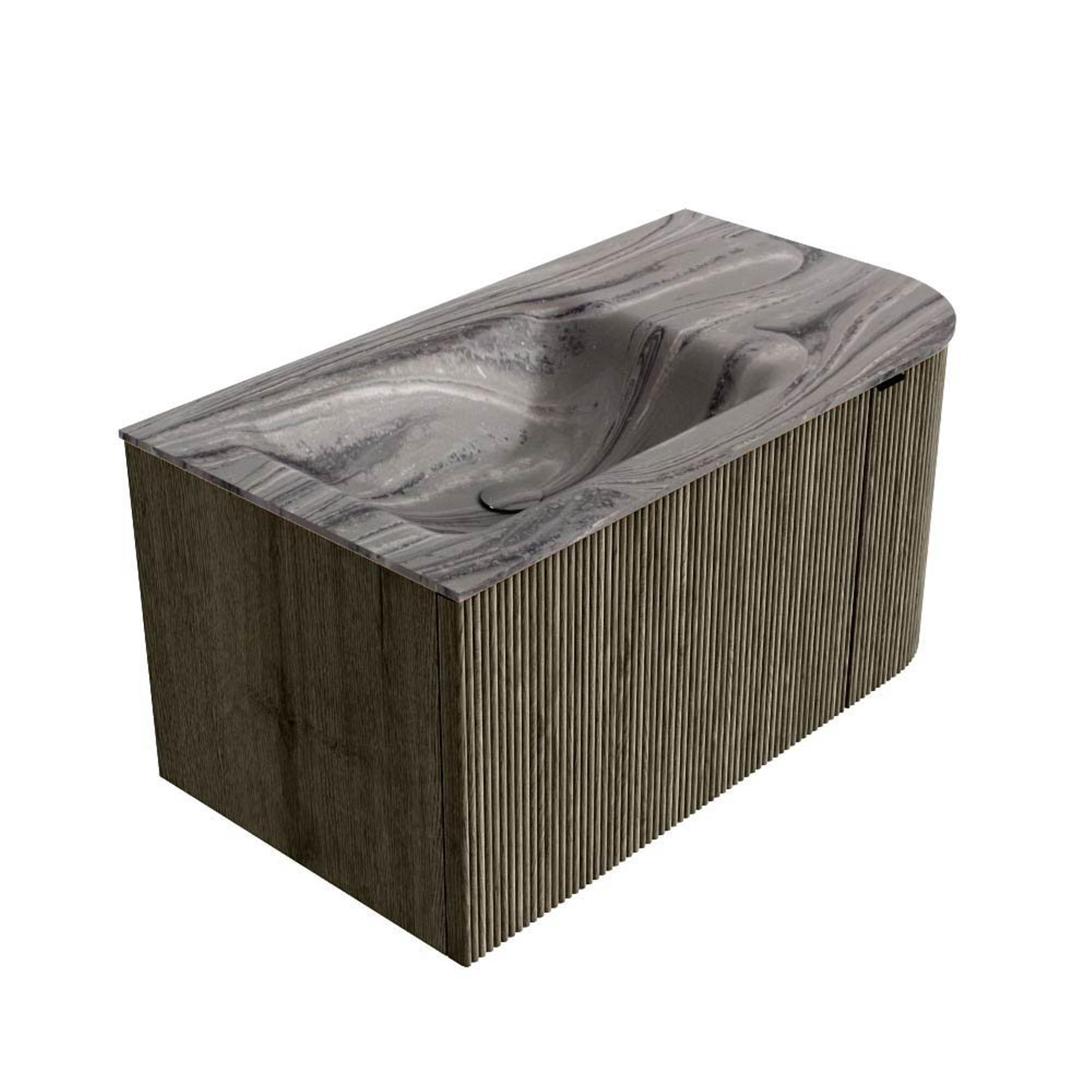 MONDIAZ KURVE-DLUX Meuble de salle de bains 85cm arrondi Droite couleur Shadow avec 1 tiroir et 1 porte. Lavabo CLOUD Gauche sans trou de robinet Sombra.