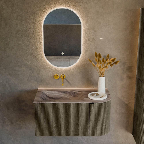 La combinaison de l’arrondi droit et de la couleur Shadow donne immédiatement à votre salle de bains une apparence haut de gamme digne d’un intérieur. Les façades à structure cannelée verticale apportent une profondeur supplémentaire et jouent joliment avec la lumière et l’ombre, ce qui fait que le meuble apparaît légèrement différent sous chaque angle. Grâce à la forme arrondie, l’ensemble paraît plus doux qu’un meuble rectangulaire standard et vous vous cognez moins facilement contre un angle vif, ce qui est appréciable dans un espace réduit ou près d’un passage. La teinte grise se marie facilement avec des carreaux blancs ou effet béton, des accents noirs ou des essences de bois chaudes, de sorte que vos choix d’aménagement restent flexibles et que votre salle de bains ne paraisse pas rapidement démodée.