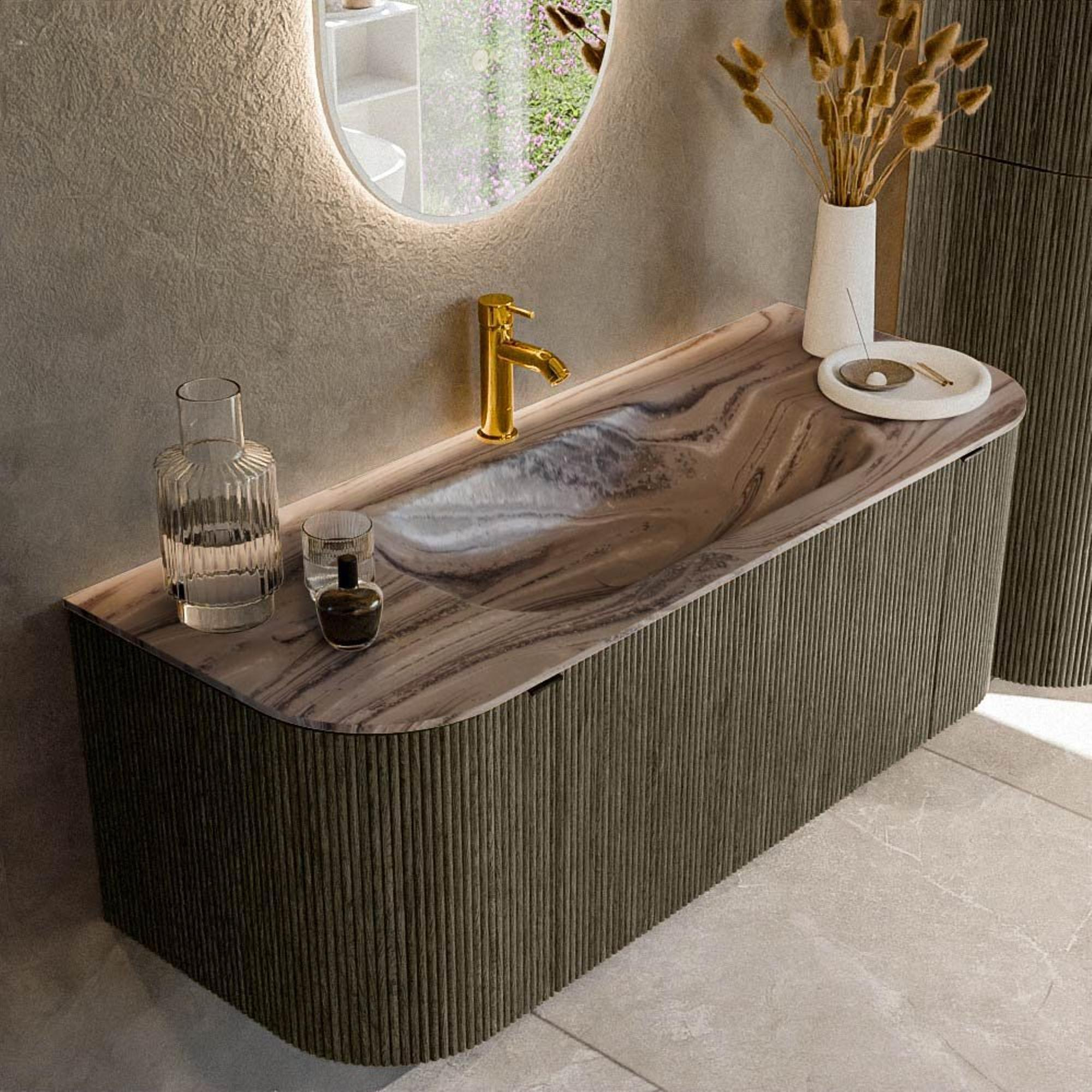 Les formes arrondies à la fois sur le côté gauche et sur le côté droit confèrent à ce meuble un caractère particulièrement chaleureux et organique. Pas de lignes dures lorsque vous passez à côté, mais une courbe douce qui se prolonge sur toute la largeur. La couleur Shadow renforce la sensation de luxe et se marie à merveille avec des robinets noirs, des carreaux effet béton ou au contraire des tons de bois chaleureux. Grâce aux façades cannelées avec structure verticale, un jeu de lumière subtil se crée, ce qui rend le meuble encore plus vivant. Vous créez ainsi un véritable point focal sous votre lavabo, sans que l’ensemble devienne criard. Ce meuble s’intègre parfaitement dans les salles de bains modernes, design ou d’inspiration hôtel chic où calme et style vont de pair.