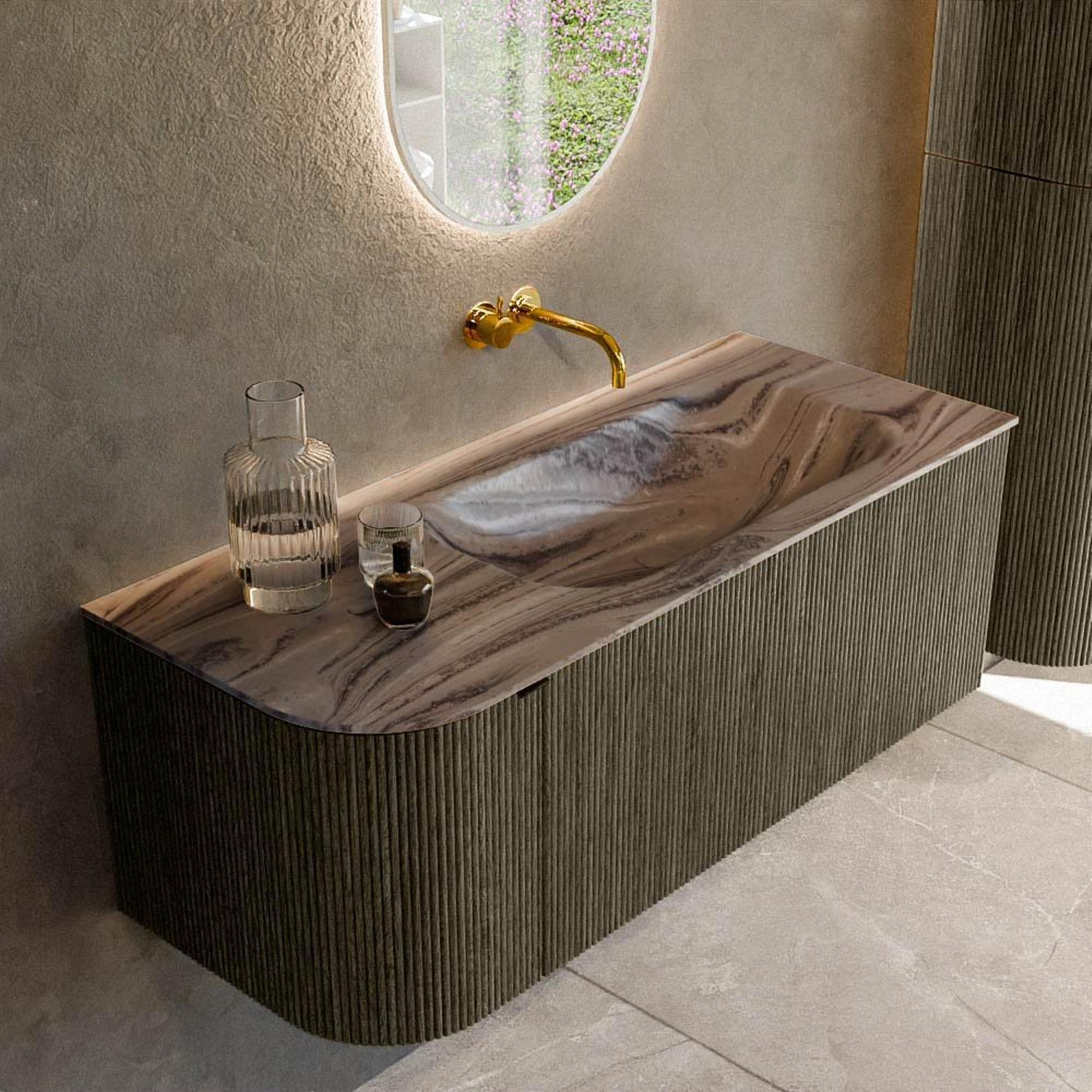 La couleur Shadow profonde et moderne du meuble, combinée au plan en Solid Surface Sombra, confère un aspect luxueux et design qui s’intègre parfaitement dans les salles de bains contemporaines. La façade à rainures verticales apporte un caractère supplémentaire et de la profondeur au meuble, ce qui en fait immédiatement un véritable accroche-regard. Cette structure fonctionne à merveille avec un éclairage doux et des matériaux naturels tels que des carreaux aspect bois ou béton. Comme le lavabo et le plan ne forment qu’un ensemble homogène, l’ensemble paraît calme et minimaliste. La version sans trou de robinetterie vous laisse libre de choisir un mitigeur posé ou un mitigeur mural élégant, avec lesquels vous pouvez affiner encore davantage le style. Que vous optiez pour une ambiance industrielle, un modernisme minimaliste ou une atmosphère d’hôtel : avec cette combinaison de couleurs et de matériaux, vous posez une base forte et intemporelle.