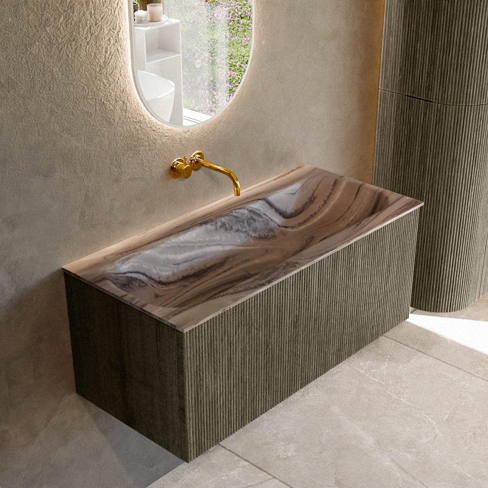 La couleur Shadow combinée à la façade rainurée verticale confère à ce meuble un aspect contemporain, presque de style boutique. Le caisson est doté de façades en chêne massif et de côtés en chêne, ce qui apporte la chaleur et la structure du vrai bois dans votre salle de bains. La structure en relief des façades crée de la profondeur dans le design et fait subtilement jouer la lumière sur la surface, ce qui crée immédiatement de l’ambiance, surtout dans les petits espaces. Grâce à la technique sans poignées push-to-open, la façade reste épurée et minimaliste, sans interruption de poignées. Cela rend ce meuble idéal si vous visez un style moderne, chic d’hôtel ou si vous souhaitez donner un coup de fouet à votre salle de bains avec une seule pièce au design remarquable.