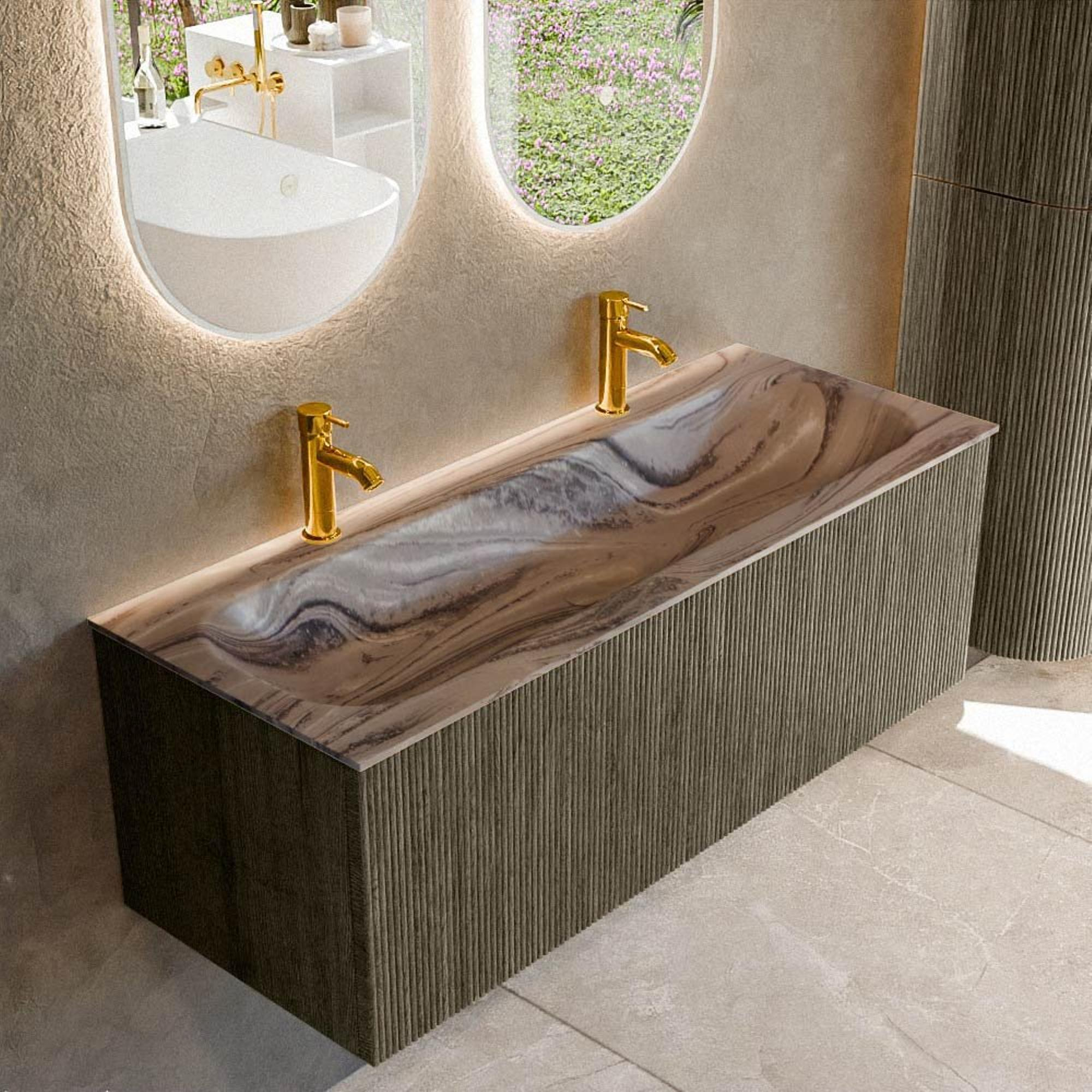 La couleur Shadow et la façade verticale à rainures donnent immédiatement à ce meuble de salle de bains un aspect haut de gamme, presque sur mesure. La texture subtile capte la lumière de manière ludique, de sorte que la façade n’apparaît jamais plane mais ajoute au contraire profondeur et caractère à votre salle de bains. La forme rectangulaire épurée et le design suspendu créent un ensemble moderne et aérien qui se marie aisément aussi bien avec des carreaux effet béton qu’avec des revêtements effet bois chaud ou pierre naturelle. Si vous recherchez un meuble qui soit plus que simplement pratique, mais qui constitue réellement le point central de votre zone lavabo, cette version est un excellent choix. Vous créez une base intemporelle que vous pouvez facilement adapter à votre style avec des accessoires et des robinets noirs, chromés ou en métal brossé.
