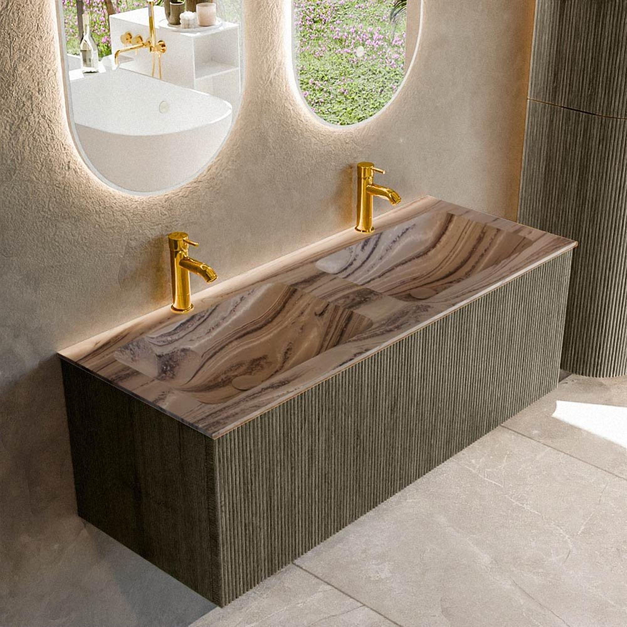 La teinte grise chaleureuse du meuble forme une base élégante qui se marie bien avec quasiment tous les carrelages et finitions murales. La façade à nervures verticales offre un aspect luxueux et architectural et rompt les lignes épurées de manière subtile, donnant ainsi à l’ensemble un aspect vivant mais néanmoins calme. Grâce à la pose murale, le meuble semble flotter, ce qui agrandit visuellement et aère votre salle de bains et s’intègre parfaitement dans un aménagement moderne ou style hôtel-chic. La couleur de la vasque s’accorde parfaitement avec cet ensemble, de sorte que le meuble et le plan ne forment qu’un seul ensemble harmonieux et élégant. Que vous optiez pour un style minimaliste, scandinave ou industriel, avec cette combinaison vous posez une base forte et intemporelle.