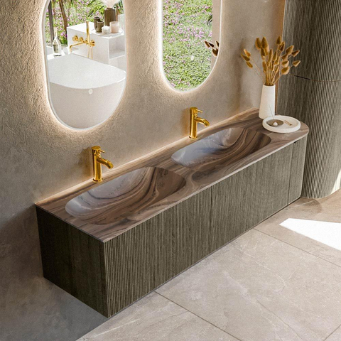 Avec ce meuble de salle de bains spacieux, vous créez en une seule fois une allure luxueuse digne d'un hôtel et énormément d'espace de rangement pratique. La largeur généreuse de 165 cm le rend idéal pour une grande salle de bains familiale ou une suite parentale confortable où vous aimez commencer la journée à deux. Grâce à l'élégante courbe sur le côté droit, l'ensemble paraît plus doux et moins massif qu'un meuble rectangulaire standard, ce qui est parfait si vous souhaitez une ambiance moderne mais tout de même accueillante dans votre salle de bains. Le double lavabo à gauche avec deux trous de robinet offre tout l'espace nécessaire pour une utilisation simultanée à deux, sans se gêner. Ce meuble est un choix judicieux si vous recherchez une combinaison de design, de fonctionnalité et de beaucoup d'espace de rangement, par exemple lors d'une rénovation où vous souhaitez aménager votre salle de bains directement de manière pérenne.